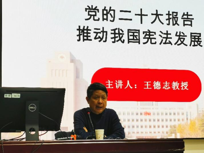 另外,第一支部黨員教師還注重將黨的二十大精神帶進課堂,大力提倡原典原著學習,為學生開展相關主題講座和學術研討活動,從學理上加深對二十大精神、習近平法治思想的認識。作為法學院舉辦的《學習宣傳貫徹黨的二十大精神培養(yǎng)卓越法治人才系列講座》之一,謝鵬程教授于2022年11月1日以《習近平法治思想指導下的中國法治和法學》為題,為山東大學法學院師生做了主題講座。王德志教授于2022年11月23日以《共同富裕的權利邏輯》為題、于12月4日以《黨的二十大報告推動我國憲法發(fā)展》為題,為山東大學青島校區(qū)師生作主題講座。陳偉助理研究員于2022年12月2日組織讀書會,與同學們一起研習肖蔚云先生著作《我國現(xiàn)行憲法的誕生》,以紀念八二憲法公布施行四十周年,感悟憲法的時代精神,聆聽憲法的“脈搏跳動”,加深對二十大報告中“加強憲法實施和監(jiān)督”要求的理解。
