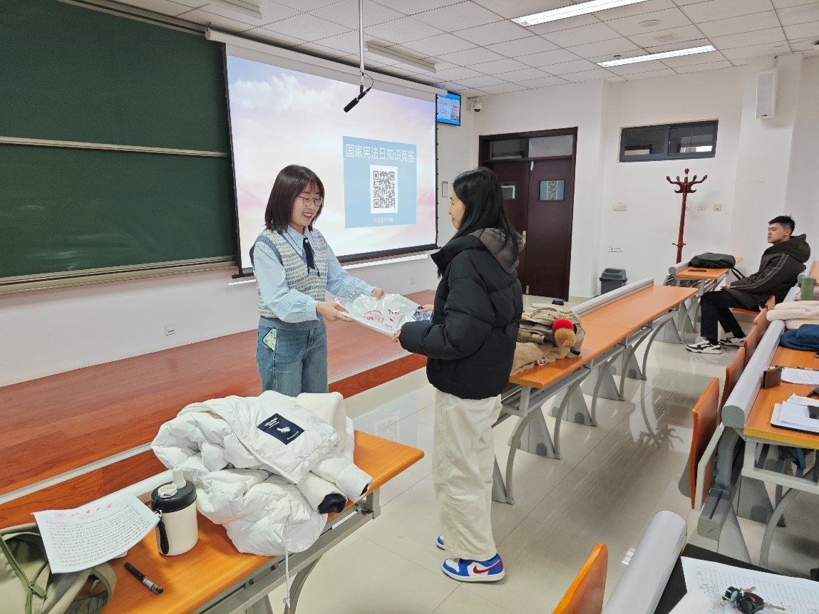 其次,支部組織委員孫麗瑤主持憲法知識快問快答趣味活動。以形式新穎、內(nèi)容豐富、寓教于樂的競賽方式不斷深化對憲法精神的理解,在比拼憲法知識的同時,更激發(fā)了廣大同學學習憲法知識、提升理論素養(yǎng)的積極性和主動性。