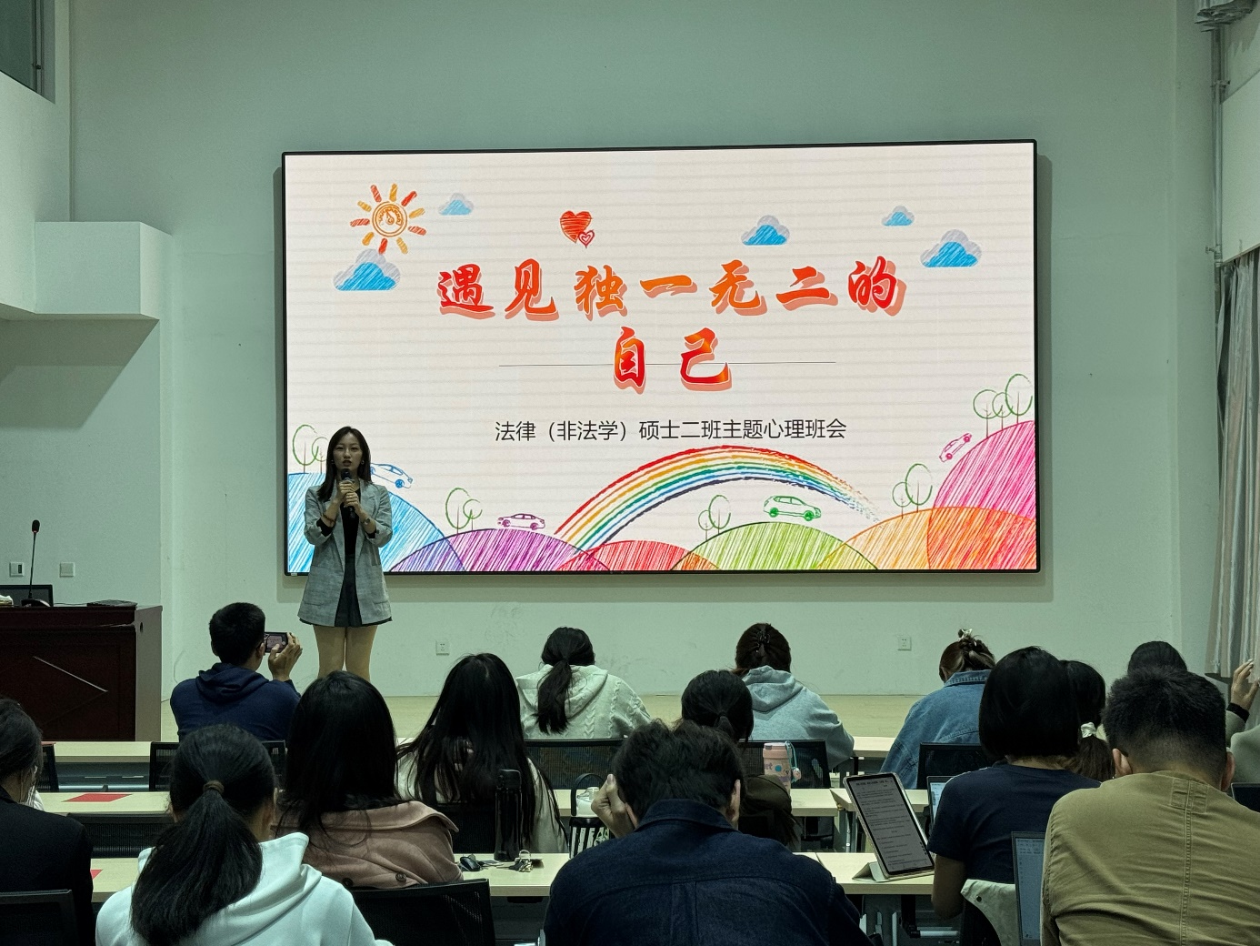 為進(jìn)一步提升心理健康素養(yǎng),引導(dǎo)同學(xué)關(guān)注自身心理健康和心靈成長(zhǎng),5月13日晚,2023級(jí)法律(非法學(xué))碩士二班與法律碩士(非法學(xué))第四黨支部開展“遇見獨(dú)一無二的自己”心理健康教育主題班會(huì),40余名班級(jí)同學(xué)參加活動(dòng)。