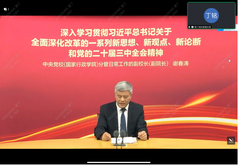 隨后,大家集體觀看了由中央黨校(國家行政學院)分管日常工作的副校長(副院長)謝春濤同志主講的《深入學習貫徹習近平總書記關(guān)于全面深化改革的一系列新思想、新觀點、新論斷和黨的二十屆三中全會精神》培訓課程。習近平總書記關(guān)于全面深化改革的一系列新思想、新觀點、新論斷,凝結(jié)著對改革開放以來特別是新時代全面深化改革寶貴經(jīng)驗的科學總結(jié),是新時代全面深化改革理論創(chuàng)新、實踐創(chuàng)新的最新成果,必將成為新征程上指導(dǎo)進一步全面深化改革的強大思想武器。