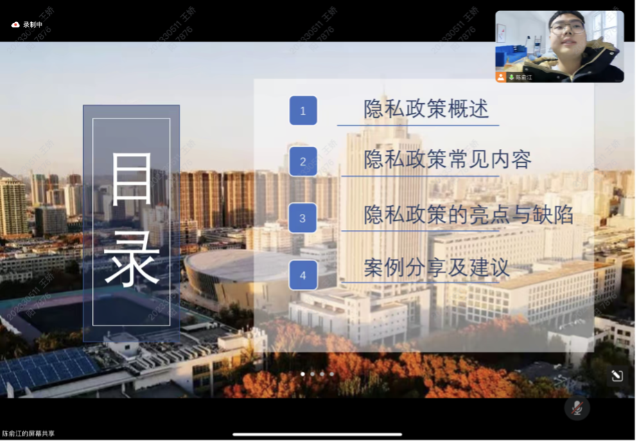 首先,陳俞江介紹了隱私政策的定義及其作為用戶與平臺之間“契約”的重要性。隨后,他詳細(xì)解讀了信息收集的必要性、信息使用的合規(guī)性、信息共享的風(fēng)險與規(guī)范、信息存儲與保護(hù)的技術(shù)手段,以及用戶查詢、更正、刪除個人信息的權(quán)利等關(guān)鍵條款。最后,結(jié)合實際案例,主講人深入剖析隱私政策在個人信息保護(hù)中的作用,并針對大學(xué)生在網(wǎng)絡(luò)使用中常見的風(fēng)險,提出了具體防范建議。