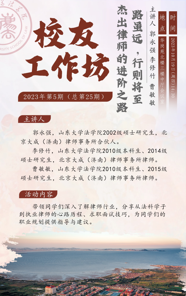 10月19日,山東大學(xué)法學(xué)院校友工作坊第25期在華崗苑北樓舉辦,本期邀請到法學(xué)院2002級碩士研究生、北京大成(濟(jì)南)律師事務(wù)所合伙人郭永強(qiáng)校友,2010級本科生、2014級碩士研究生、北京大成(濟(jì)南)律師事務(wù)所律師李修竹校友,2010級本科生、2015級碩士研究生、北京大成(濟(jì)南)律師事務(wù)所律師曹敏敏校友。三位校友以“從法學(xué)生到律師的進(jìn)階之路”為主題向同學(xué)們分享了律所工作的心得體會與求職面試經(jīng)驗(yàn)。