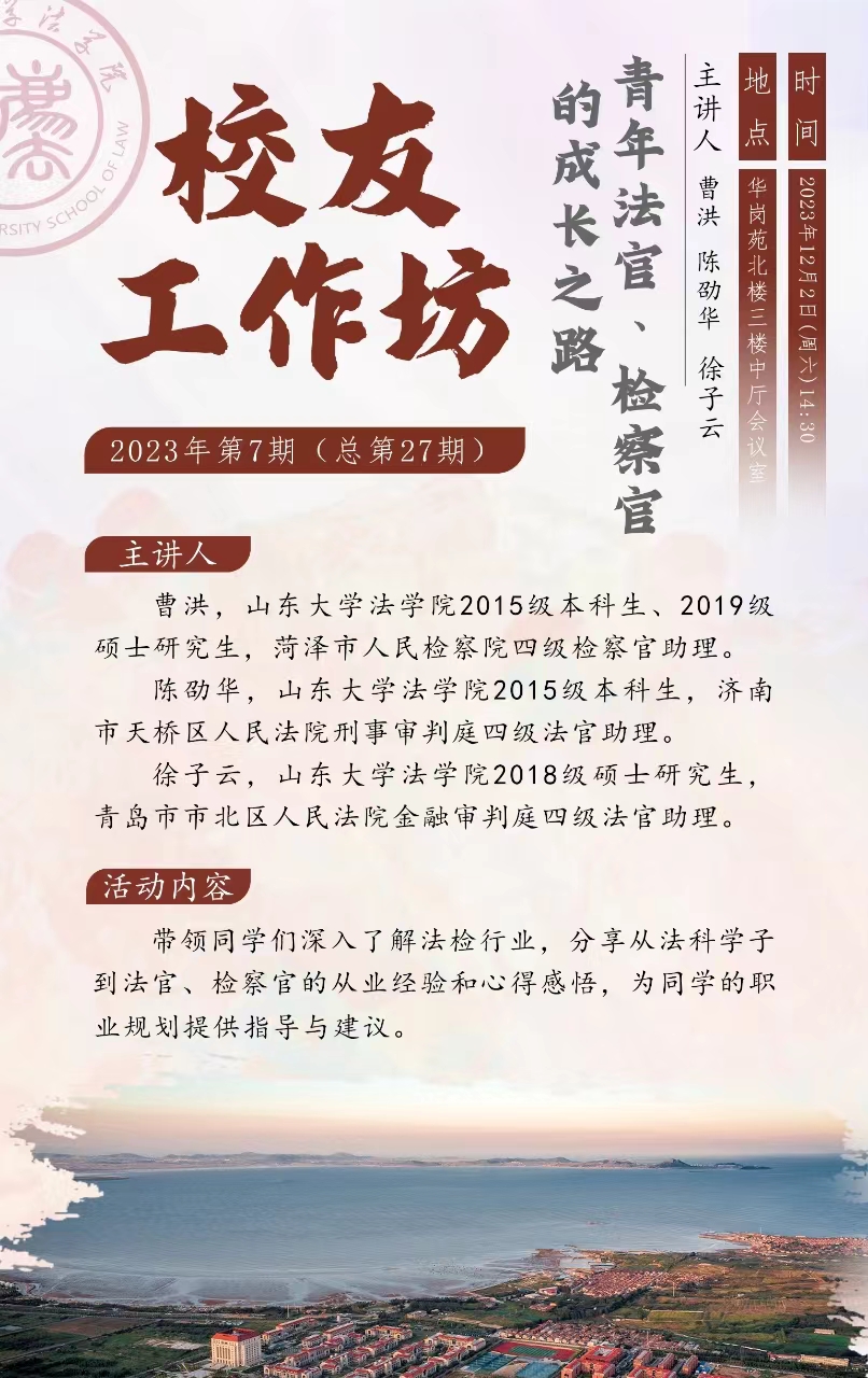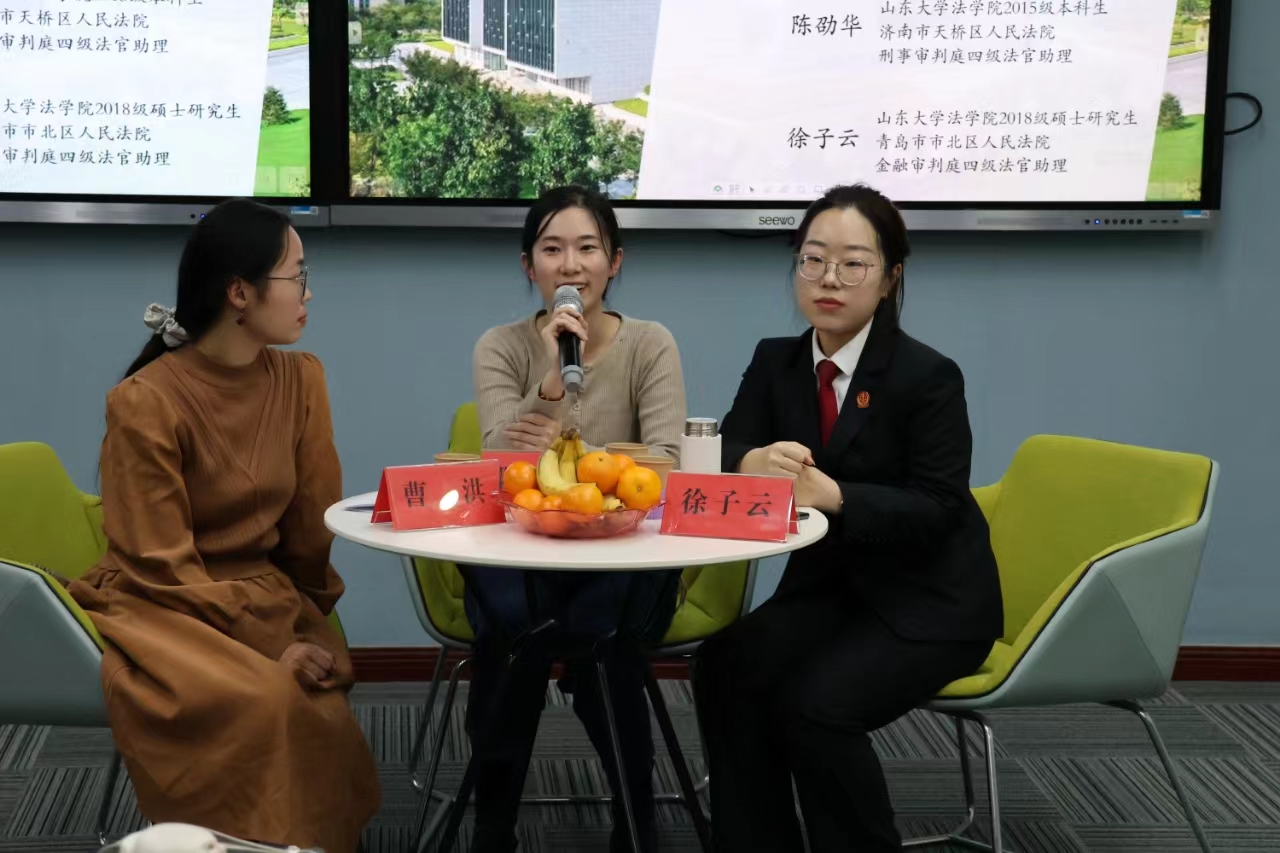12月2日,法學(xué)院校友工作坊第27期在青島校區(qū)舉行。參加本期工作坊的校友為法學(xué)院2015級(jí)本科生、2019級(jí)碩士研究生曹洪(就職于菏澤市人民檢察院),2015級(jí)本科生陳?ài)咳A(就職于濟(jì)南市天橋區(qū)人民法院),2018級(jí)碩士研究生徐子云(就職于青島市市北區(qū)人民法院)。三位校友以“青年法官、檢察官的成長(zhǎng)之路”為題,分享了她們?cè)诜z系統(tǒng)的從業(yè)經(jīng)驗(yàn)和心得感悟。