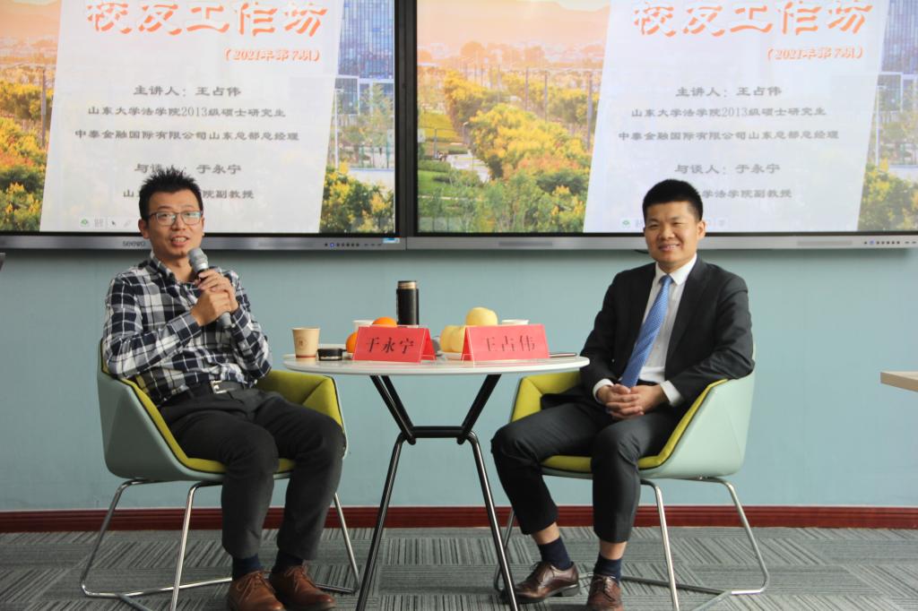 5月9日,法學(xué)院校友工作坊2021年第7期邀請到山東大學(xué)法學(xué)院2013級碩士研究生、中泰金融國際有限公司山東總部總經(jīng)理王占偉。王占偉以“法科背景下的證券行者”為題向同學(xué)們分享了他在證券公司的從業(yè)歷程與經(jīng)驗感悟。山東大學(xué)法學(xué)院于永寧副教授作為與談人參加了活動。
