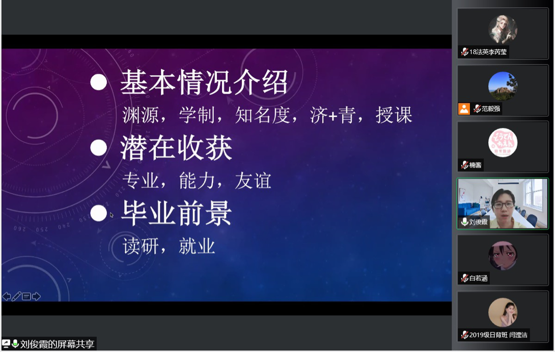 為增進(jìn)2022級新生對法學(xué)院涉外法治人才特色班的了解,學(xué)院于9月7日在線上召開2022級特色班選拔宣講會。法學(xué)院副院長馮俊偉教授,李長勇副教授,劉俊霞副教授和劉楠楠老師出席會議,教務(wù)秘書范毅強(qiáng)主持會議。2019級中日經(jīng)貿(mào)法律班閻瀅潔、白若涵同學(xué)、2018級法學(xué)與英語雙學(xué)位班李芮瑩同學(xué)作了經(jīng)驗交流。