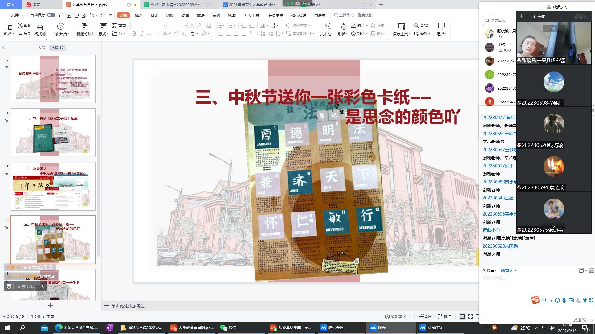 9月12日全天,學(xué)院研究生辦公室研究生秘書張曉敏分別為不同類別、階段的282名研究生新生開啟培養(yǎng)管理與學(xué)術(shù)規(guī)范部分入學(xué)教育,從四個(gè)方面詳細(xì)講解研究生培養(yǎng)環(huán)節(jié)與學(xué)術(shù)規(guī)范的重要性,指導(dǎo)同學(xué)們制定培養(yǎng)計(jì)劃、提示解決日常學(xué)業(yè)問題思路,暑期更新的“法學(xué)院研究生事記月歷”也提前通過云端與同學(xué)們相見。