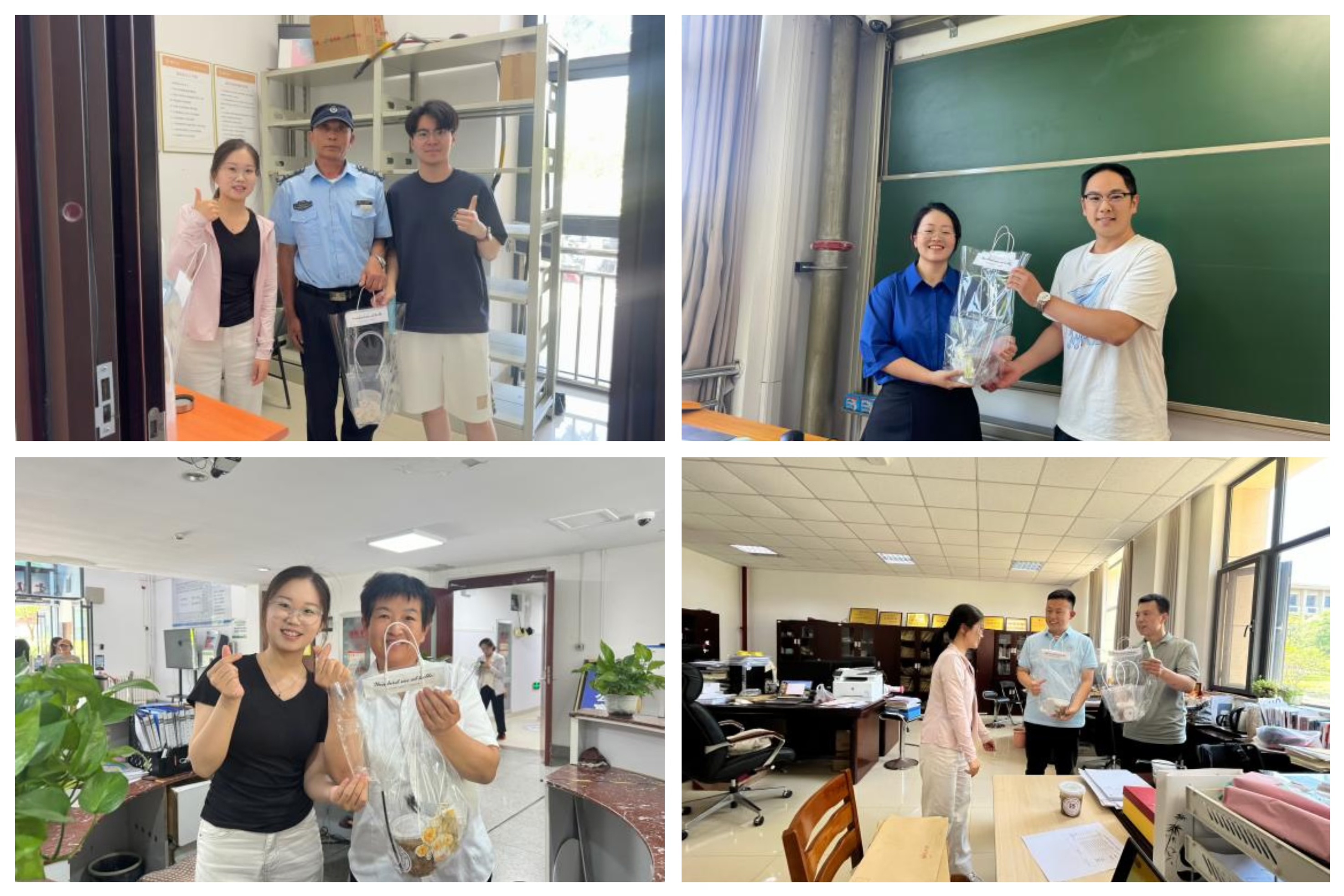 法學院“青青法睦”農(nóng)場中的小麥在同學們的悉心管理下喜獲豐收,6月7日,學院師生共同勞作,割麥子、捆秸稈,共同體驗豐收的喜悅。12日,經(jīng)過脫粒、晾曬,餐廳將師生們的勞動成果制成夏日解暑祛濕飲品——綠豆麥仁甜湯。適逢畢業(yè)季,為感恩四年來默默付出的校園守護者,學院畢業(yè)生黨員代表化身“清涼使者”,他們耐心細致地將甜湯分裝打包,貼上精心設(shè)計的暖心貼紙,附上親手書寫的卡片,將一份份承載著心意的甜湯,送到耕耘講臺的老師們、堅守崗位的保安叔叔、宿管阿姨手中。這份源于土地、成于雙手的樸素心意,跨越了田間到舌尖的距離,讓校園的守護者感受到被珍視、被尊重的溫暖。