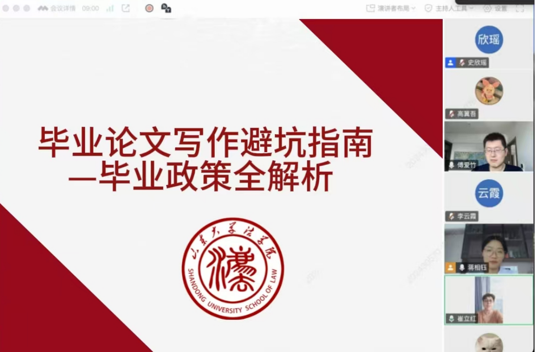 7月8日,“勤于筆耕”法學(xué)院碩士學(xué)位論文寫作指導(dǎo)系列活動(dòng)之“畢業(yè)論文寫作避坑指南——畢業(yè)政策全解析”講座于線上成功舉辦。本期講座由法學(xué)院副院長(zhǎng)崔立紅教授、助理研究員傅愛竹、研究生秘書蔣相鈺擔(dān)任主講人。近三百余位師生參加講座。