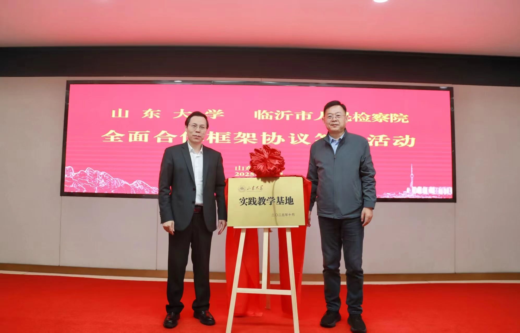周長(zhǎng)軍與孟憲偉代表雙方簽訂合作框架協(xié)議,于向明與孟憲偉共同為“山東大學(xué)實(shí)踐教學(xué)基地”揭牌。