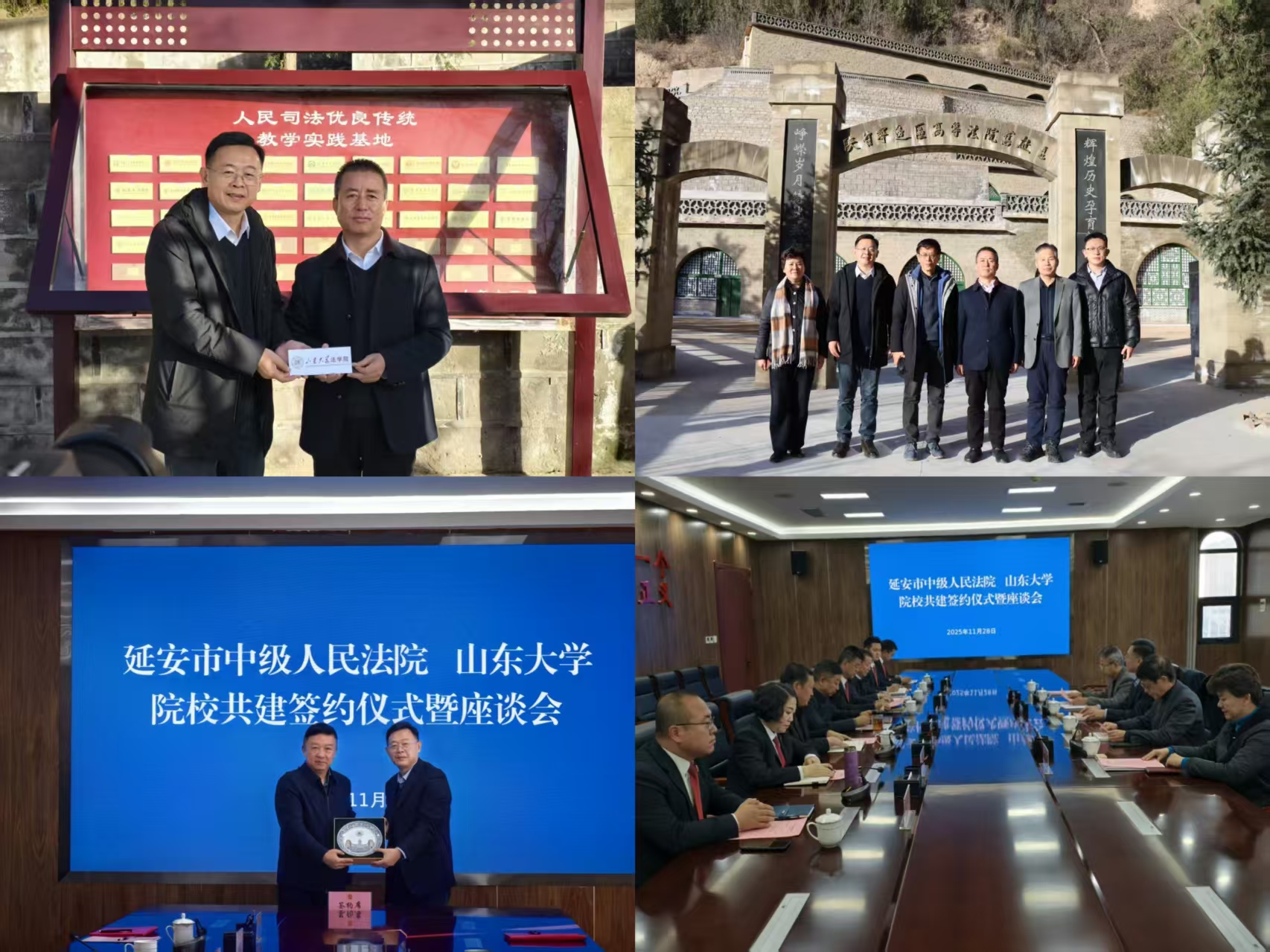 11月27日至28日,調(diào)研組赴陜甘寧邊區(qū)高等法院舊址、陜甘寧邊區(qū)審判史陳列館、延安市中級(jí)人民法院,實(shí)地觀摩珍貴史料,深刻體會(huì)“馬錫五審判方式”等人民司法優(yōu)良傳統(tǒng)的精神內(nèi)涵與時(shí)代價(jià)值。延安中院黨組書記、院長劉群,副院長劉向林等陪同調(diào)研。調(diào)研組在陜甘寧邊區(qū)高等法院舊址掛牌設(shè)立“人民司法優(yōu)良傳統(tǒng)教學(xué)實(shí)踐基地”。調(diào)研組與延安市中級(jí)人民法院進(jìn)行座談交流,于向明與劉群簽署院校合作框架協(xié)議,雙方將充分利用延安紅色資源,結(jié)合學(xué)校理論研究優(yōu)勢和法院司法實(shí)踐能力,在理論研究、紅色法治文化資源發(fā)掘、教育培訓(xùn)、實(shí)習(xí)就業(yè)等方面積極探索共建、合作模式。