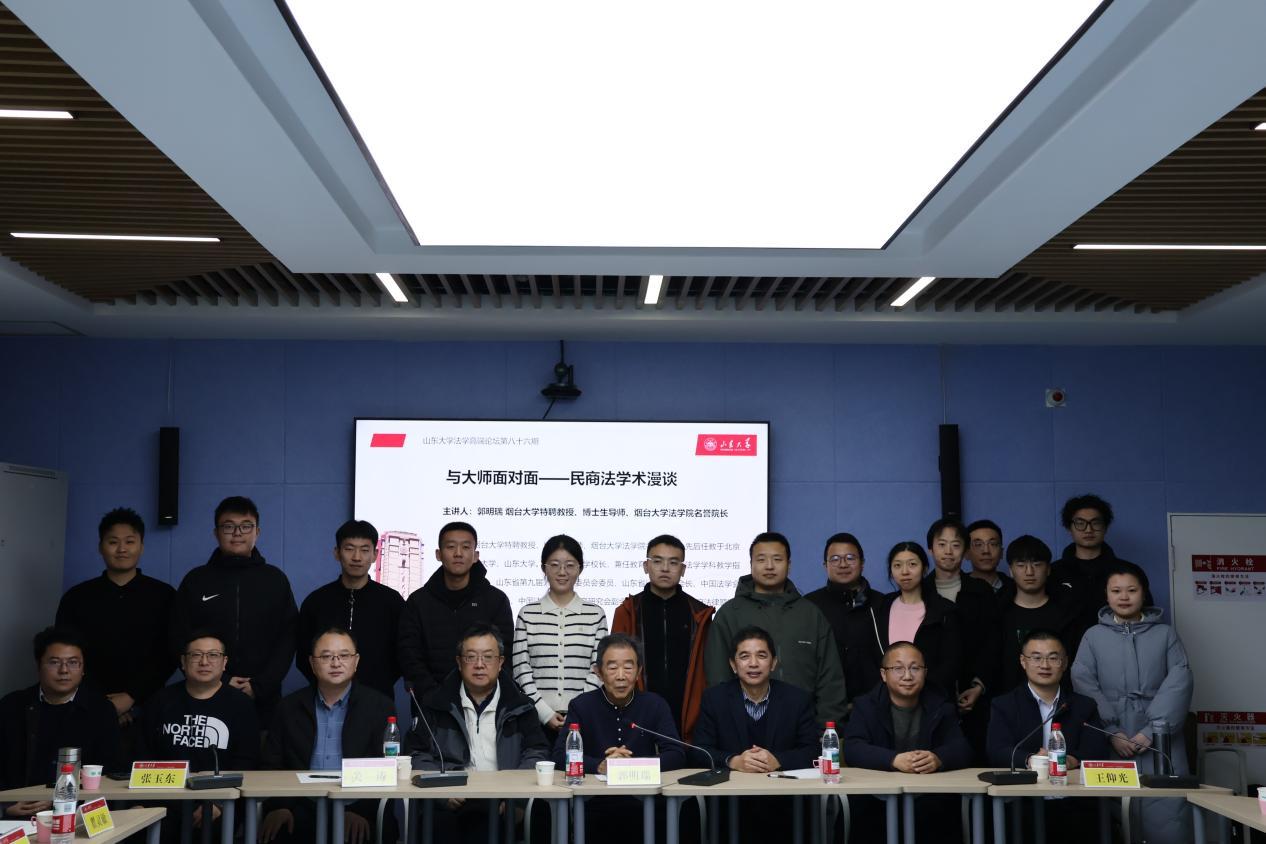 12月26日,“山東大學(xué)法學(xué)高端論壇”第八十六期于青島校區(qū)華崗苑舉辦。煙臺大學(xué)法學(xué)院名譽院長郭明瑞教授圍繞民商法領(lǐng)域的前沿理論與實踐難題展開學(xué)術(shù)漫談。講座由山東大學(xué)法學(xué)院張平華教授主持,煙臺大學(xué)法學(xué)院關(guān)濤教授、張玉東教授,山東大學(xué)紀(jì)檢監(jiān)察學(xué)院劉經(jīng)靖教授,山東大學(xué)法學(xué)院遲德強副教授、宿營講師,中國海洋大學(xué)法學(xué)院瞿靈敏副教授,青島科技大學(xué)法學(xué)院石文靜副教授,山東財經(jīng)大學(xué)法學(xué)院王仰光副教授,山東農(nóng)業(yè)大學(xué)侯圣賀副教授擔(dān)任與談人,法學(xué)院三十余名師生參與講座。