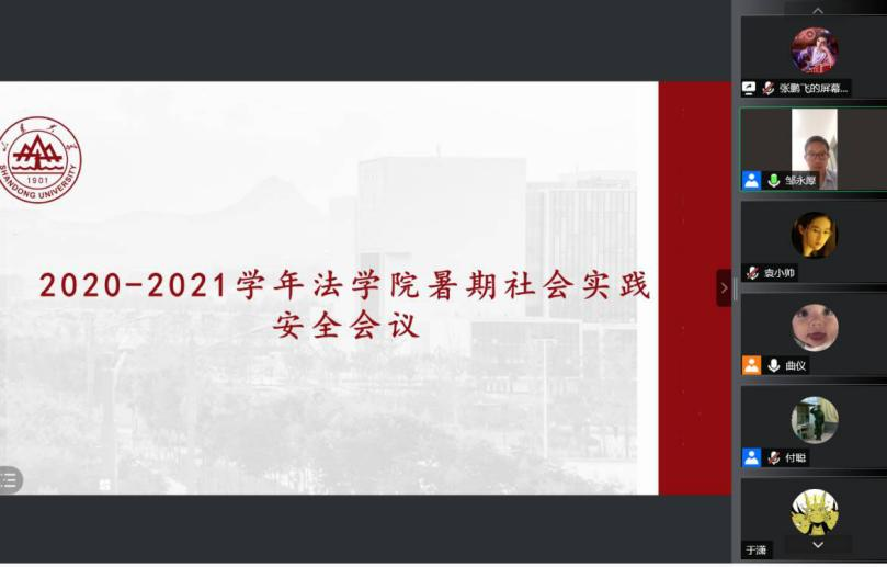 7月15日晚,法學(xué)院2021年暑期學(xué)生實(shí)踐實(shí)習(xí)安全工作會(huì)議于線上進(jìn)行。法學(xué)院黨委副書(shū)記鄒永厚與全體輔導(dǎo)員參會(huì),學(xué)院暑假社會(huì)實(shí)踐團(tuán)隊(duì)、黨建立項(xiàng)團(tuán)隊(duì)以及實(shí)習(xí)團(tuán)隊(duì)全體成員、各班班長(zhǎng)、團(tuán)支書(shū)到會(huì)學(xué)習(xí)。會(huì)議由學(xué)院團(tuán)委副書(shū)記曲儀主持。