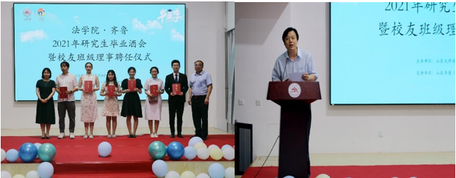 6月22日晚,法學院2021屆研究生畢業(yè)酒會暨校友班級理事聘任儀式在華崗苑北樓學術活動中心舉行。法學院黨委書記于向明、院長周長軍,學院領導班子、教師代表、校友代表與2021屆研究生畢業(yè)生共同參加本次活動。周長軍在致辭中囑咐畢業(yè)生“不忘初心,明法篤行”, 向研究生畢業(yè)生表達了祝福與期待。隨后,副院長張海燕和校友代表王剛為畢業(yè)生校友班級理事頒發(fā)聘書。師生舉杯共慶,互訴不舍之情,共話美好祝福與期盼。