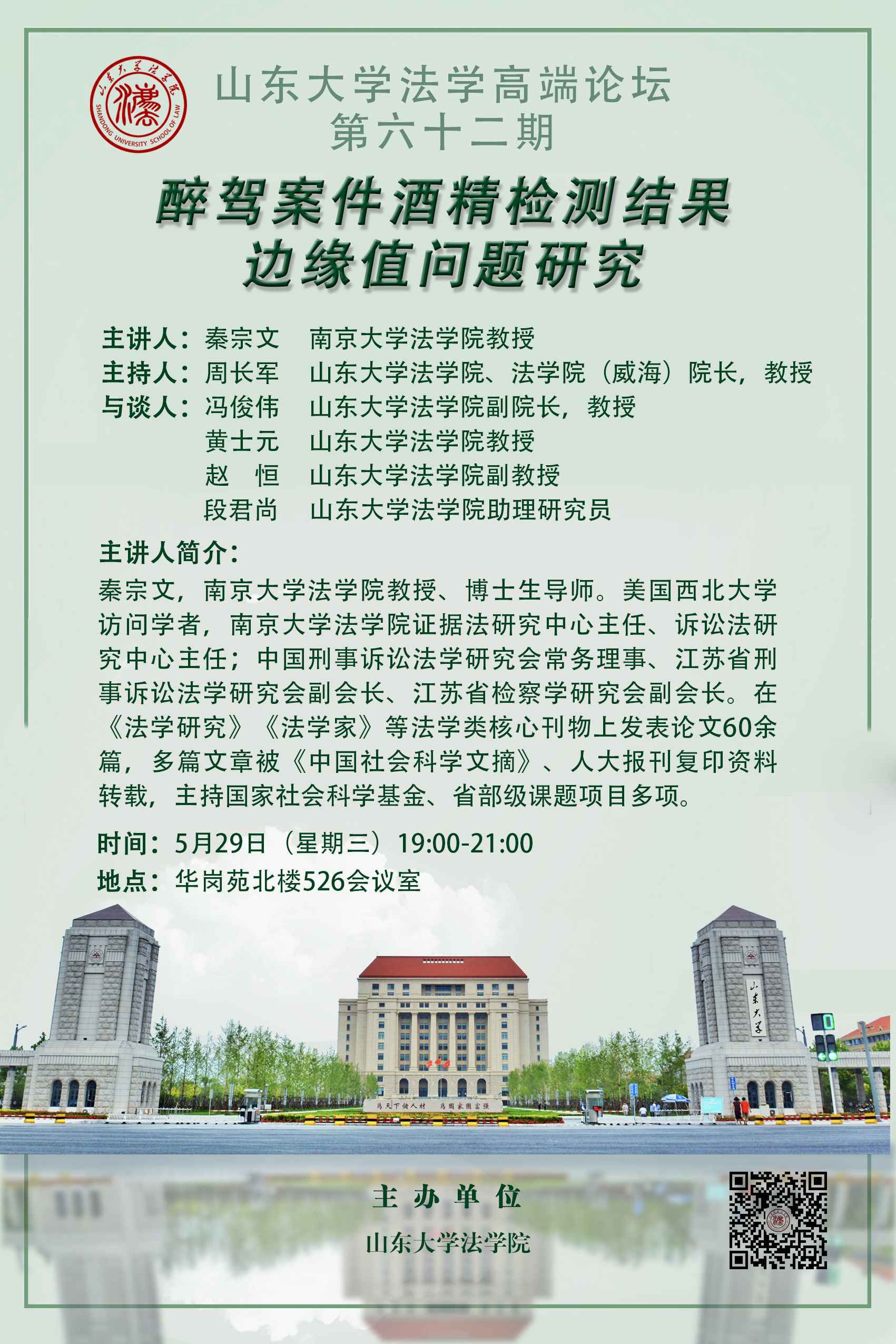 講座預告 | 山東大學法學高端論壇第六十二期:醉駕案件酒精檢測結(jié)果邊緣值問題研究