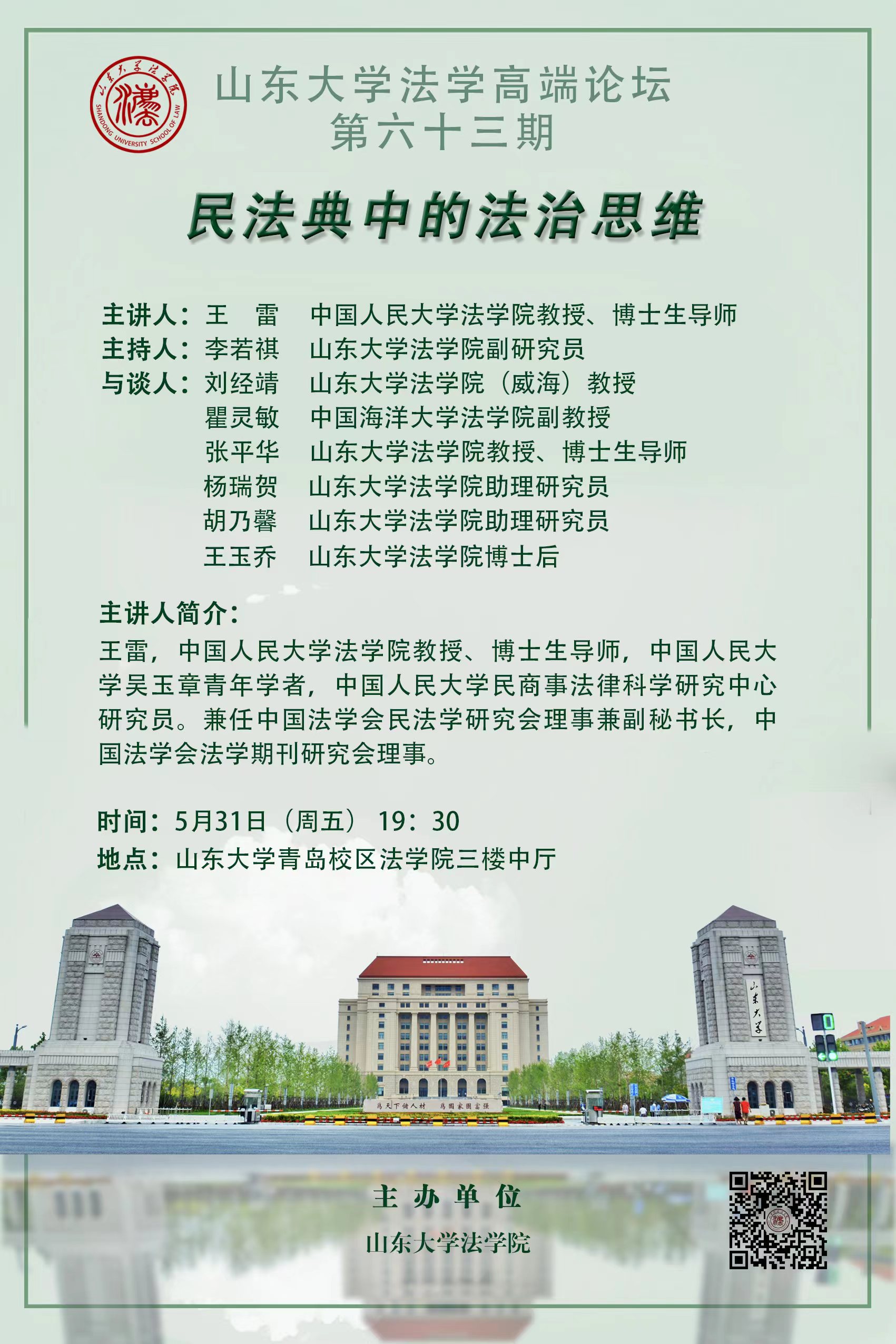 講座預(yù)告 | 山東大學(xué)法學(xué)高端論壇第六十三期:民法典中的法治思維