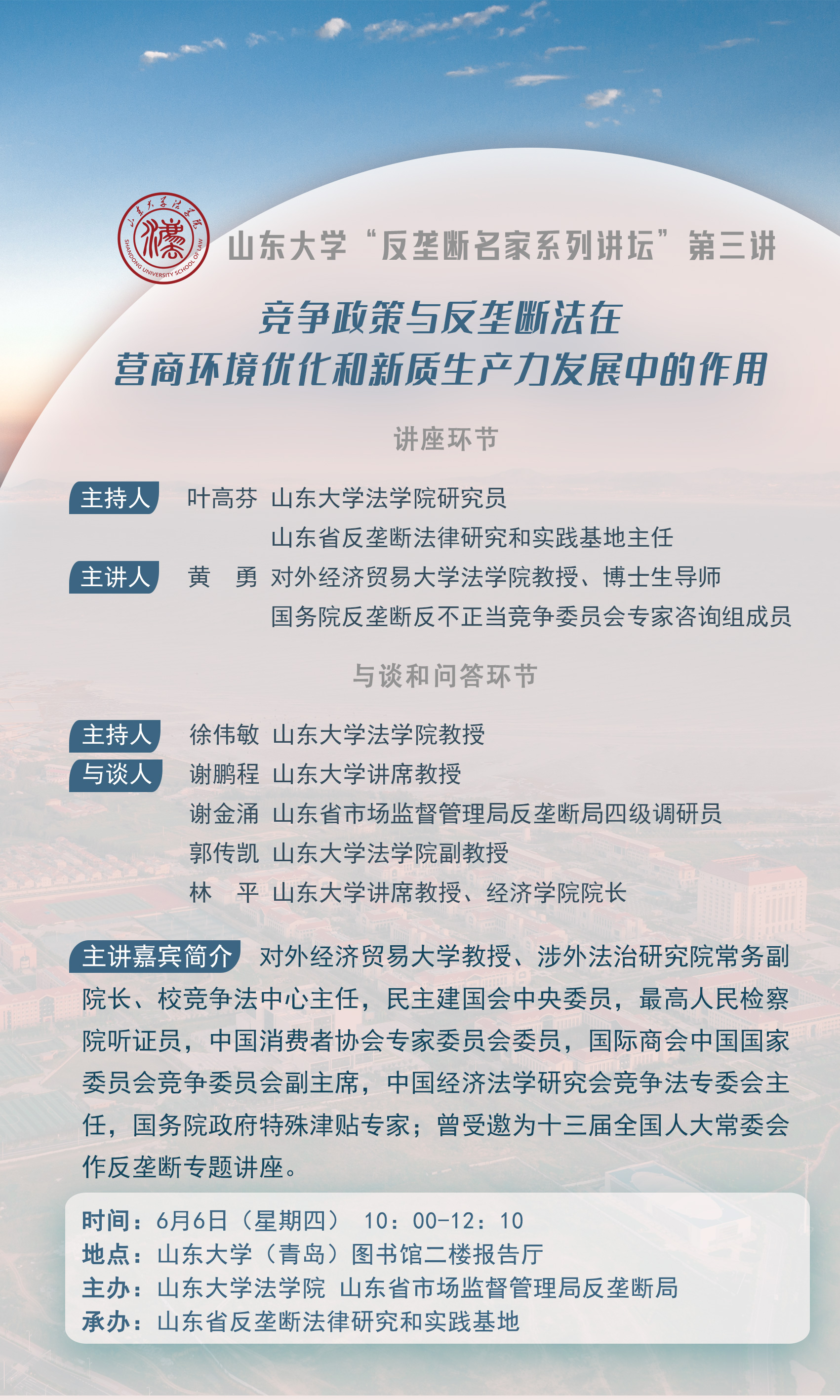 講座預告 | 山東大學“反壟斷名家系列講壇”第三講:競爭政策與反壟斷法在營商環(huán)境優(yōu)化和新質生產力發(fā)展中的作用