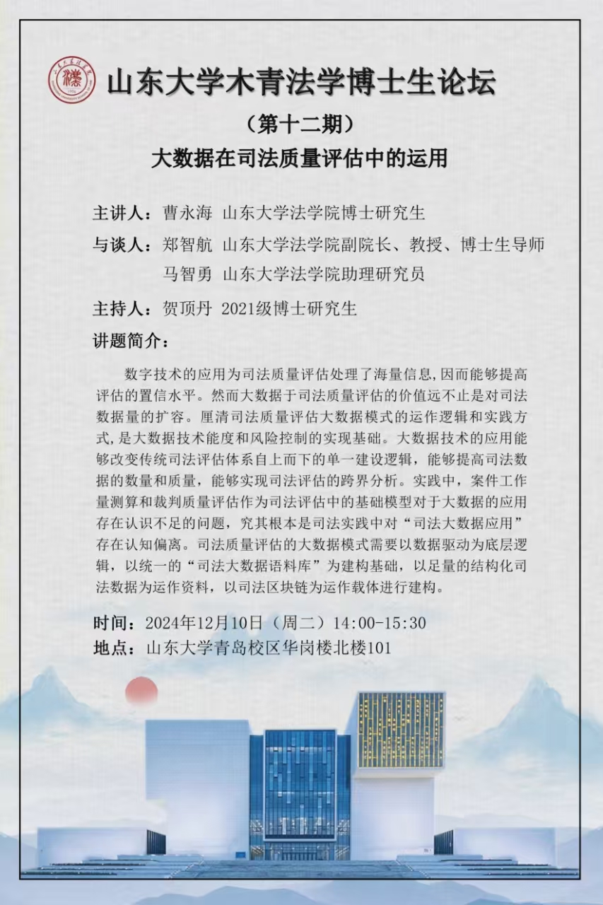 講座預(yù)告 | 山東大學(xué)木青法學(xué)博士生論壇(第十二期):大數(shù)據(jù)在司法質(zhì)量評估中的運(yùn)用
