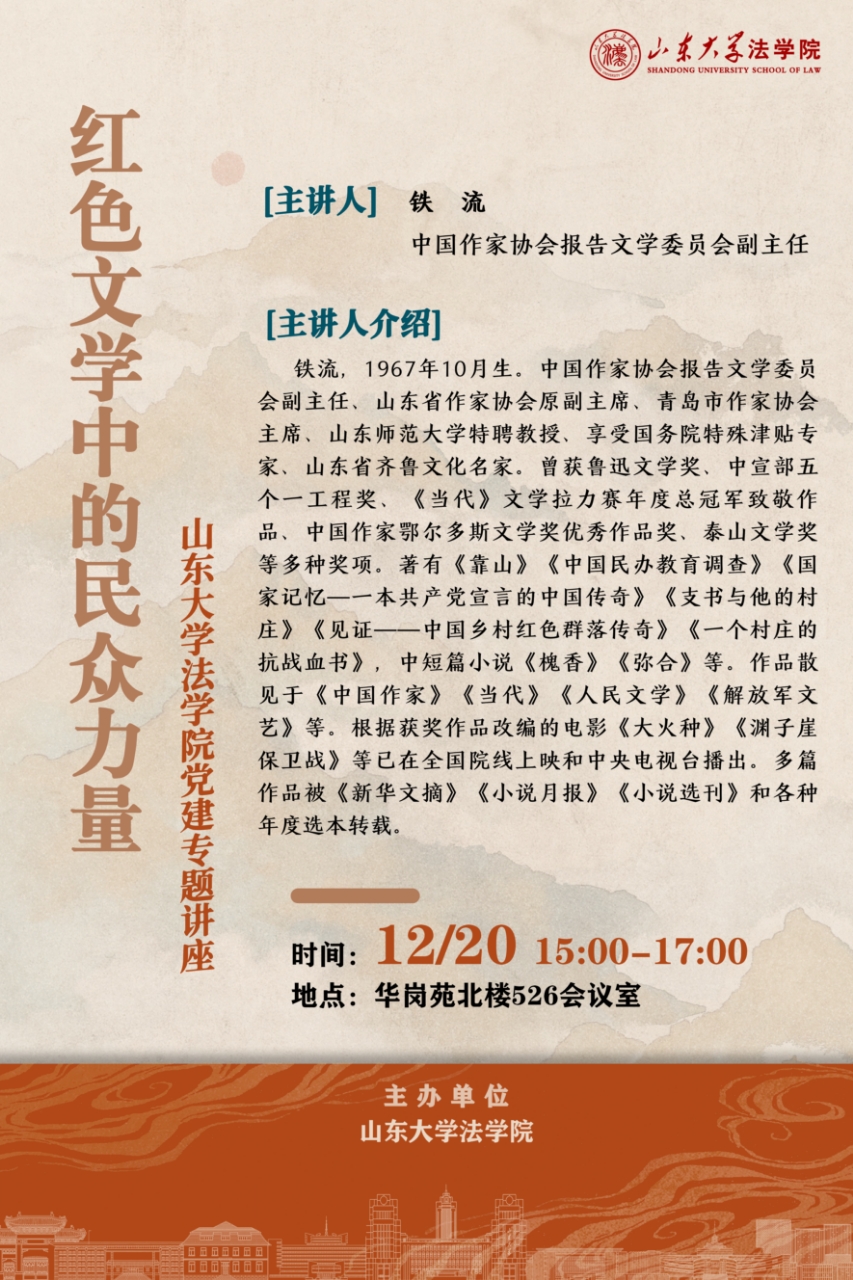 講座預(yù)告|山東大學(xué)法學(xué)院黨建專題講座:紅色文學(xué)中的民眾力量