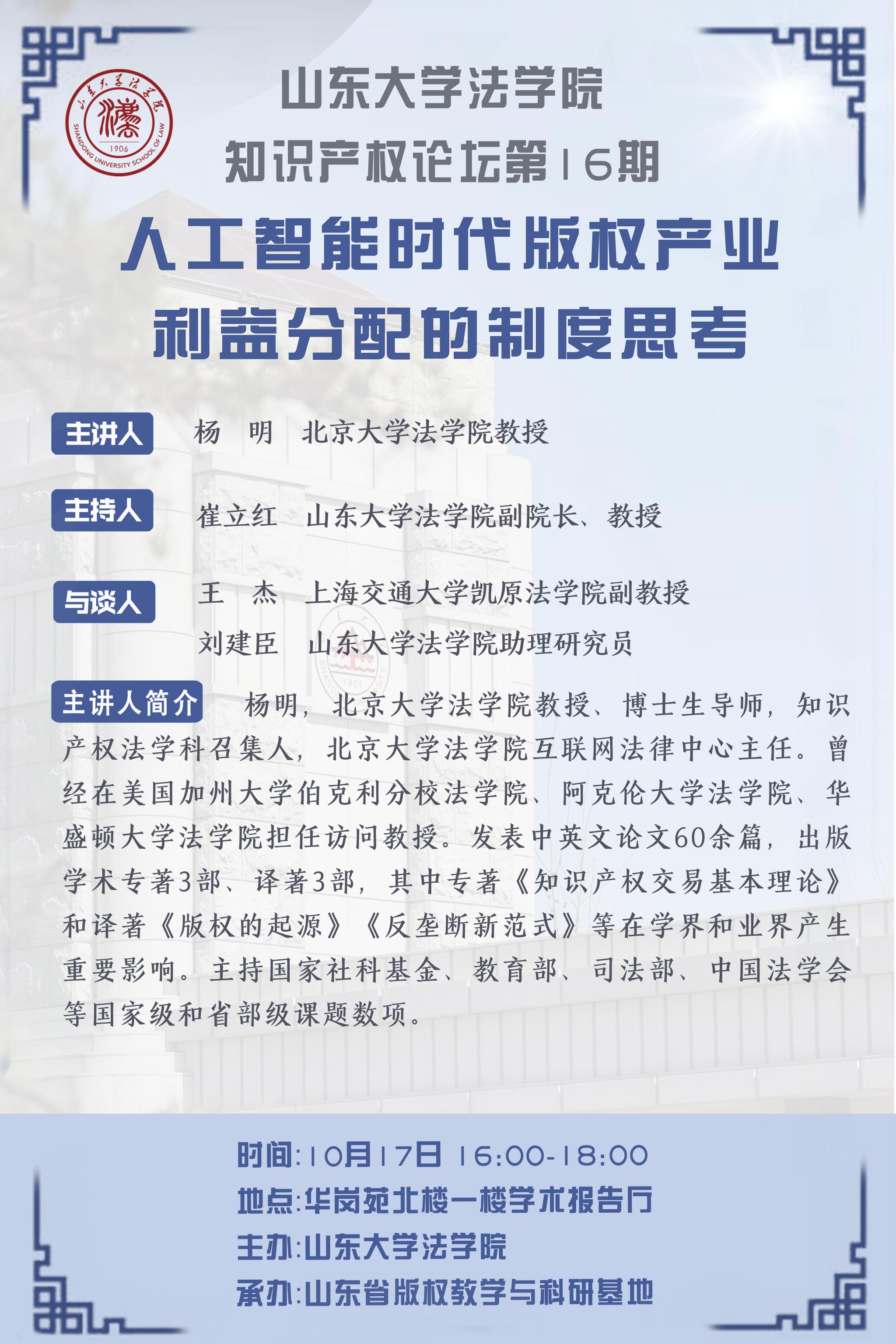 講座預(yù)告 | 山東大學(xué)法學(xué)院知識(shí)產(chǎn)權(quán)論壇第16期:人工智能時(shí)代版權(quán)產(chǎn)業(yè)利益分配的制度思考
