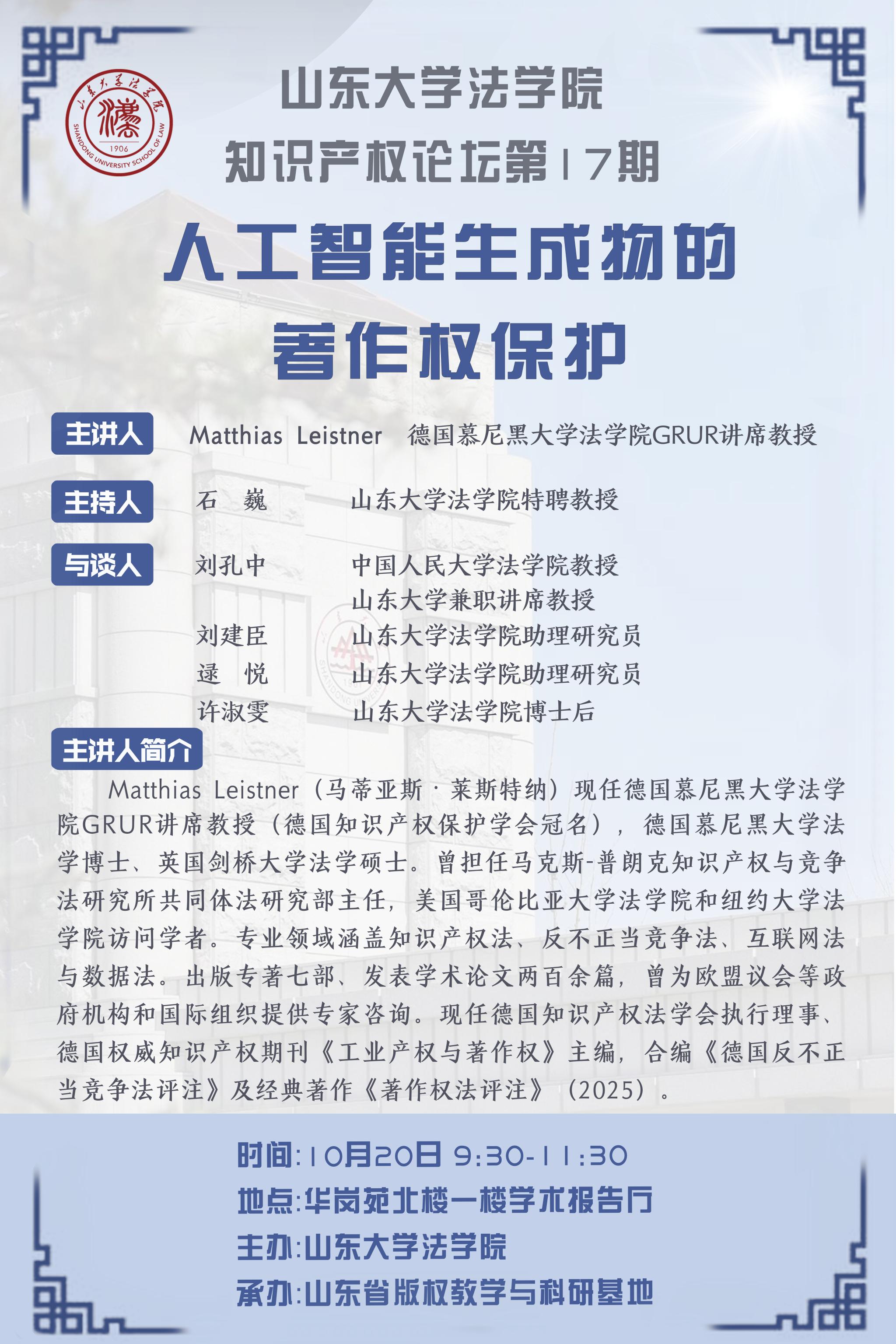 講座預(yù)告 | 山東大學(xué)法學(xué)院知識(shí)產(chǎn)權(quán)論壇第17期:人工智能生成物的著作權(quán)保護(hù)