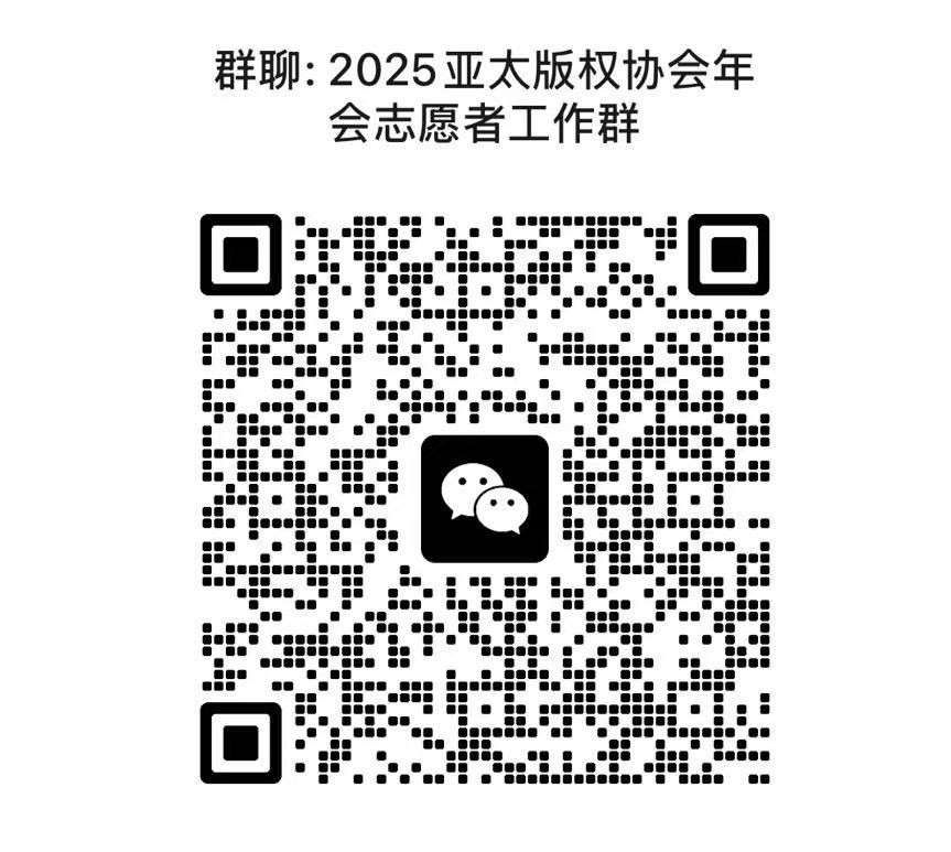 請以上同學在10月14日前實名加入“2025亞太版權協(xié)會年會志愿者工作群”,后續(xù)相關通知將在群內發(fā)布,微信二維碼如圖: