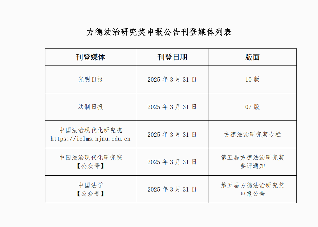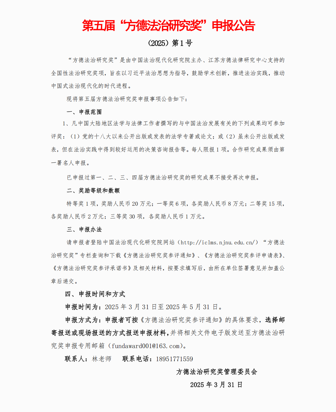 第五屆方德法治研究獎申報邀請函(附申報公告、參評通知)