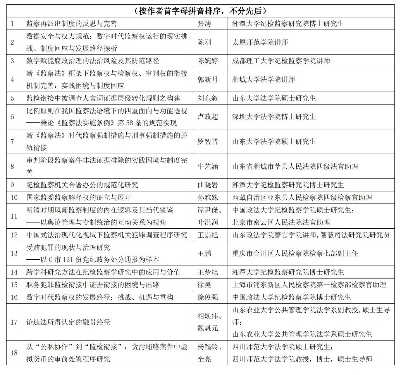 截至2025年10月30日,“中國(guó)特色監(jiān)察制度的法理基礎(chǔ)與實(shí)踐邏輯”研討會(huì)暨山東省法學(xué)會(huì)監(jiān)察法學(xué)研究會(huì)2025年學(xué)術(shù)年會(huì)主題征文活動(dòng)共收到論文80篇。經(jīng)會(huì)務(wù)組組織專(zhuān)家進(jìn)行評(píng)審,共評(píng)選出優(yōu)秀論文33篇。其中,一等獎(jiǎng)5篇、二等獎(jiǎng)10篇、三等獎(jiǎng)18篇。現(xiàn)將優(yōu)秀論文獲獎(jiǎng)建議名單予以公示,公示期為3個(gè)工作日。如有異議,請(qǐng)及時(shí)向會(huì)務(wù)組反映,聯(lián)系郵箱:dahan92@163.com。