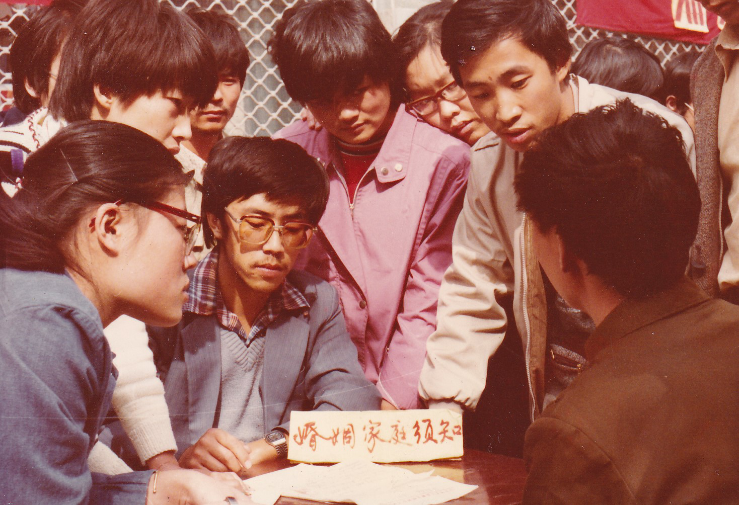 1988年10月14日下午,法學(xué)社成員一行二十余人在濟(jì)南市大觀園商場舉行了義務(wù)法律咨詢,咨詢從下午一點開始。共設(shè)置刑法、經(jīng)濟(jì)法、婚姻法等七個咨詢專臺,前來咨詢的群眾絡(luò)繹不絕,有工人、農(nóng)民,也有國家干部法人代表。在短短的四個小時內(nèi),共接待群眾約四百余人,解答法律疑難問題二百余人次,有一個經(jīng)商個體戶,把訴訟材料和證明材料全都帶了過去,前來咨詢他的官司該怎么打。面對一名名群眾,同學(xué)們熱情、耐心地解答,直到群眾滿意為止。(法律系范明志,圖片中手扶眼鏡的為八四級經(jīng)濟(jì)法班吳建中同學(xué))