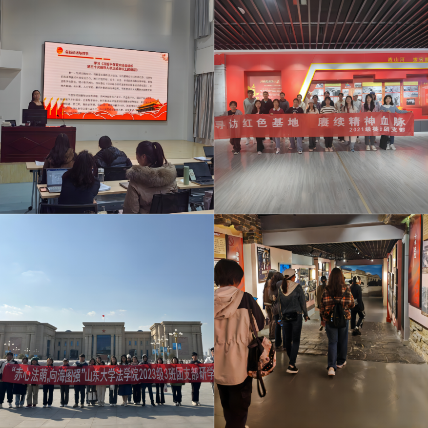 圍繞“理論學習”主題,2022級法律碩士(非法學)二班團支部以“青春·使命·擔當”為主線,開展專題理論學習。團支部著眼于理論聯(lián)系實際的要求,運用主題團課、專題演講、觀看錄影、撰寫心得筆記等多種方式促學;2022級法律碩士(非法學)一班團支部以“交流研討展風采,活動促學樹新風”為主題,立足支部成員實際情況,以“思之悟之,行之踐之”為目標,開展線上線下學習交流、黨團知識趣味游戲和紅歌合唱等形式豐富的團日活動。在“實踐體驗”主題,2021級法學與英語雙學位班團支部、2022級法學二班團支部、2023級法學二班團支部、2023級法學三班團支部、2023級中日經(jīng)貿法律特色班團支部結合校內外紅色資源,于鰲角石黨史館、青島黨史紀念館、海軍博物館、青島市革命烈士紀念館和五四廣場等地參觀學習,在實踐中感悟紅色精神。在“青春建功”主題,2022級法學三班團支部組織開展了“校園微公交”志愿服務先鋒崗等系列“張三”品牌志愿公益活動,結合專業(yè)特色,深化青年學生的社會責任感;2023級法學一班團支部開展凈灘志愿服務和線上海洋環(huán)保宣傳,增強同學們的環(huán)境保護意識;學生法學社團支部組織進行了多次團課理論學習,開展“憲法知識知多少”答題闖關、憲法知識競賽等系列實踐活動,將法學學科理論與實踐相結合,推動法治校園建設。