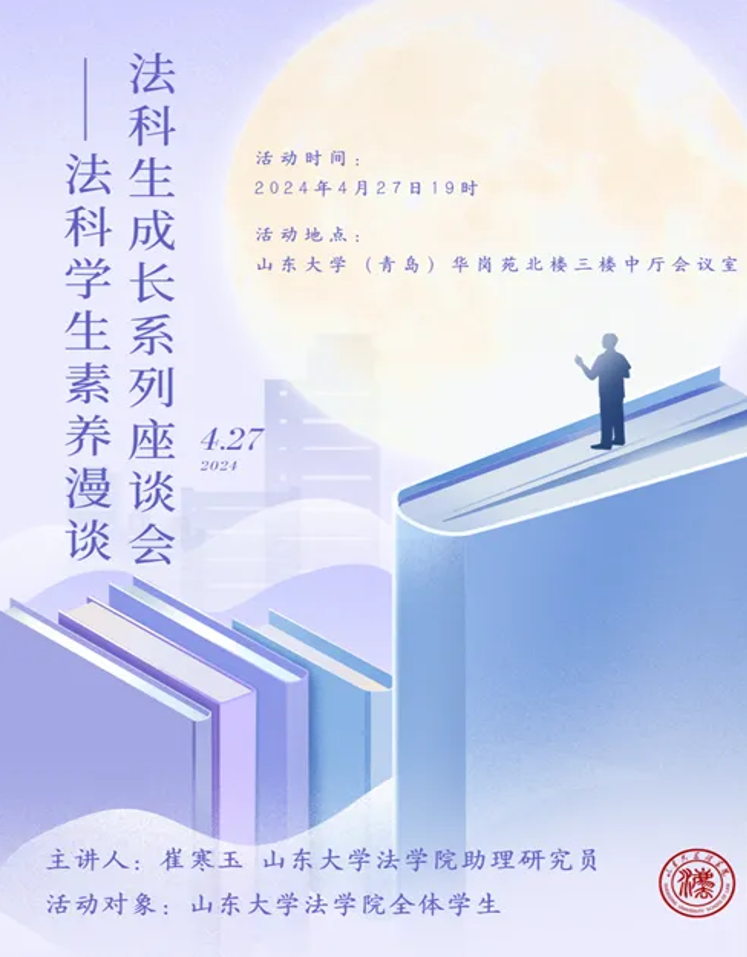 4月27日晚,法科學(xué)生成長系列座談會2024年第2期在華崗苑舉行。本次座談會的主題為“法科學(xué)生素養(yǎng)漫談”,由山東大學(xué)法學(xué)院崔寒玉助理研究員擔(dān)任主講人,和同學(xué)們分享法學(xué)生如何提高自己的綜合素養(yǎng)。
