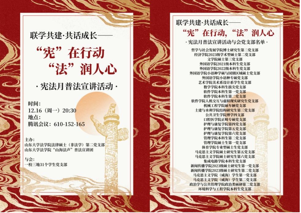 為進(jìn)一步宣傳憲法知識(shí),弘揚(yáng)憲法精神,法律碩士(非法學(xué))第二黨支部主動(dòng)發(fā)起,聯(lián)合山東大學(xué)一校三地共32個(gè)學(xué)生黨支部開展“‘憲’在行動(dòng),‘法’潤人心”普法宣傳活動(dòng),法學(xué)院黨委副書記董雪梅、副處級(jí)組織員江小荃出席活動(dòng)。此次活動(dòng)由法律碩士(非法學(xué))第二黨支部書記范艷華主持,一校三地一千余名黨員、積極分子共同參與此次聯(lián)學(xué)活動(dòng)。