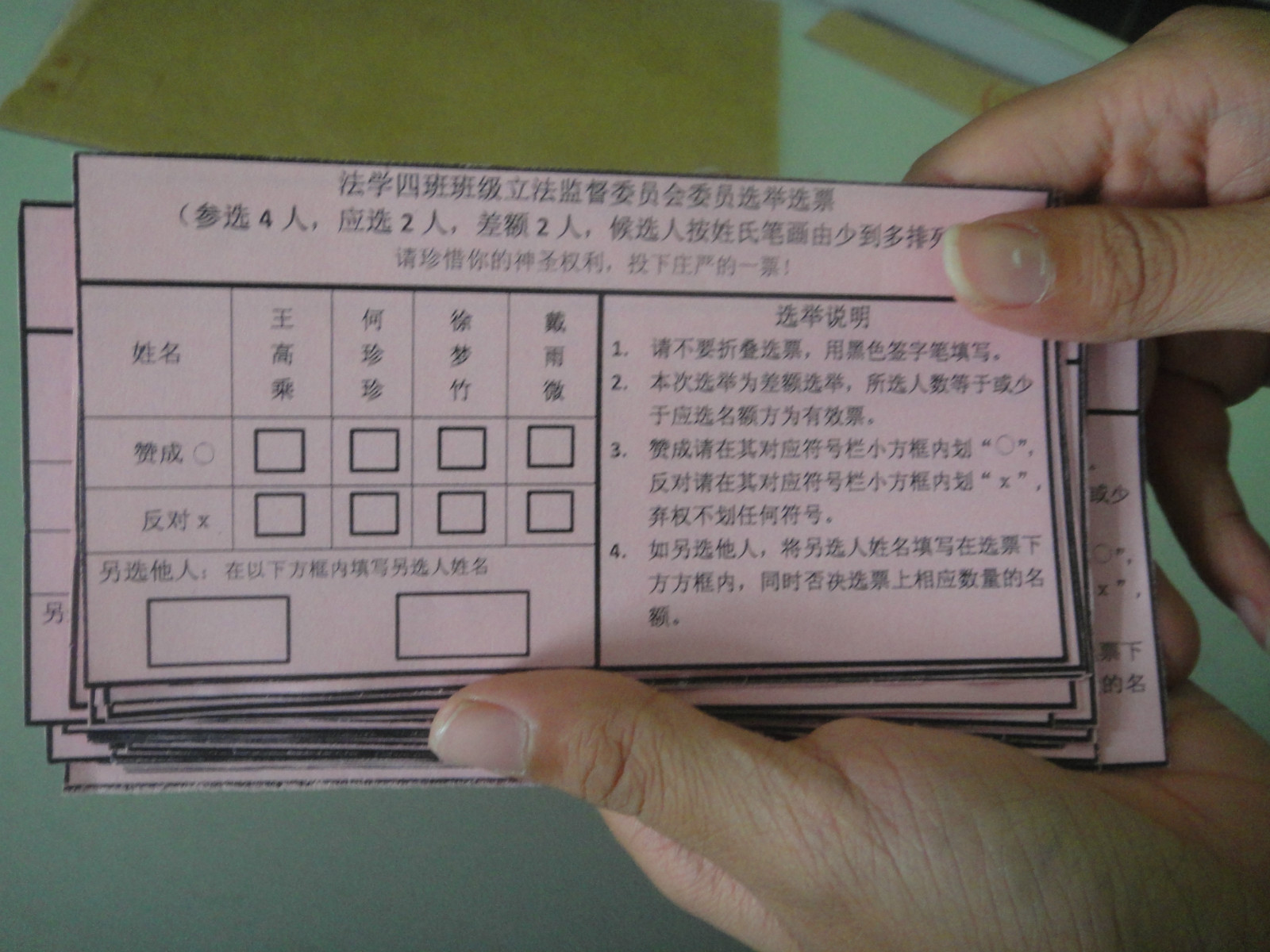 上,首先由班長劉顯楷與團支書黃春林先后致辭,用真誠懇切的話語向同學們介紹了本次活動的意義,呼吁同學們積極參與。接下來進行立法監(jiān)督委員會委員選舉,在四名候選人依次上臺進行演講后,會議通過差額選舉、公開唱票及統(tǒng)票的透明流程最終確定了監(jiān)督委員名單,何珍珍、王高乘同學當選。其中最值得一提的,是選舉流程的正規(guī)性,韓尚宜同學參照全國人大代表的選舉制定了此次流程,并與梁尚寧同學一道制作了正式選票,這也大大提高了同學對本次班級立法的關注與重視,同時也彰顯了本次立法活動的嚴肅性與規(guī)范性。