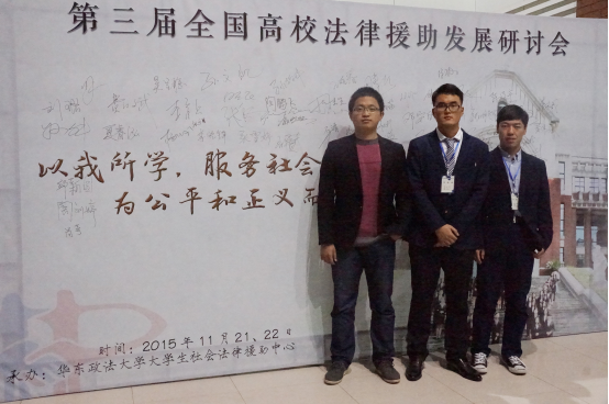 2015年11月21日至22日,第三屆全國高校法律援助發(fā)展研討會在華東政法大學召開。本屆研討會以“互聯(lián)網+時代下新媒體模式在高校法律援助過程中的適用與發(fā)展”為主題,邀請了來自全國29所高校的法援中心代表參與活動,部分實務界法官、律師一同受邀,各方代表共聚一堂,共同為高校法律援助的發(fā)展出謀劃策。山東大學法律援助中心李彥兵、劉璐、孫科作為山東大學代表,參加了此次會議。