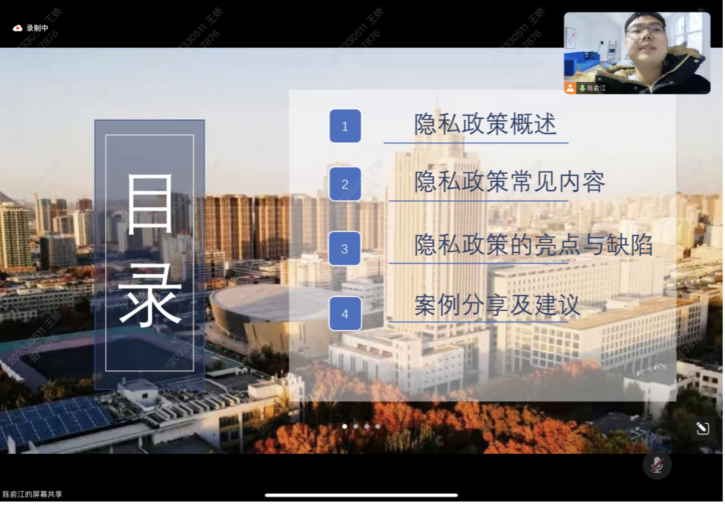 2月14日,聚焦大學生個人信息保護的《電商平臺隱私政策解讀》線上宣講會借助騰訊會議平臺順利舉行。本次宣講會由山東大學法學院“網(wǎng)安共治”赴即墨區(qū)關于電商平臺個人信息保護調(diào)研團成員陳俞江主講,吸引了四十余位高校學生參與。