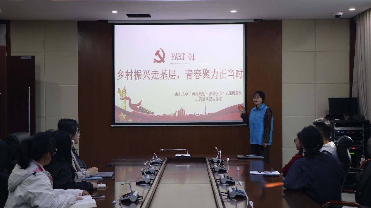 10月16日,團(tuán)隊(duì)成員曹婧婧面向山東大學(xué)法學(xué)院部分本科生、研究生分享了志愿服務(wù)活動(dòng)的心得體會(huì)。曹婧婧以“推進(jìn)法治鄉(xiāng)村建設(shè)助力鄉(xiāng)村振興——高密市松興屯村法治鄉(xiāng)村創(chuàng)建的探索與實(shí)踐”為主題展開宣講,結(jié)合志愿服務(wù)團(tuán)隊(duì)在“濰坊市民主法治示范村、高密市新農(nóng)村建設(shè)先進(jìn)村”——松興屯村的調(diào)研經(jīng)歷,分享了松興屯村在基層治理中的民主化和法治化實(shí)踐經(jīng)驗(yàn),并以“加強(qiáng)法律服務(wù),發(fā)揮司法惠民作用”為出發(fā)點(diǎn)重點(diǎn)談?wù)摿巳绾瓮晟品ㄖ梧l(xiāng)村建設(shè)中公共法律服務(wù)體系。