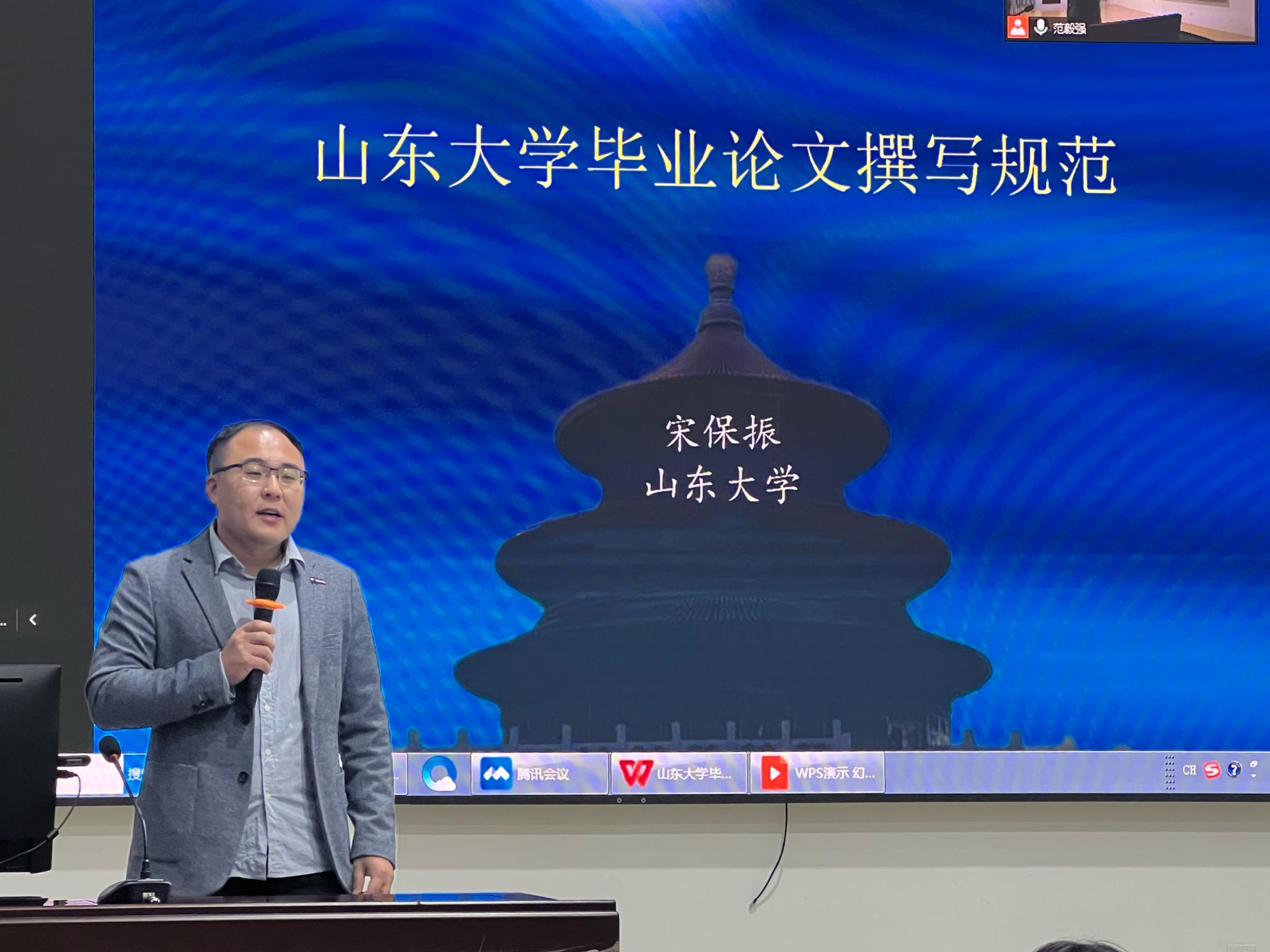 宋保振以“山東大學畢業(yè)論文撰寫規(guī)范”為題作了寫作輔導報告。宋保振首先強調(diào)本科畢業(yè)論文寫作過程中要重基礎,輕創(chuàng)新;列框架,講邏輯;講規(guī)范,認真寫。隨后,他從選題立意、文章標題、參考資料、邏輯架構(gòu)、言語表達、寫作進度、獨到見解七個方面詳細介紹了論文寫作的技巧與關(guān)鍵點,如在選題立意方面要有問題意識,在擬定文章標題時要刪繁就簡,邏輯架構(gòu)要清晰明了等。宋保振還指出在論文寫作各環(huán)節(jié)中常出現(xiàn)的問題并提出了切實有效的建議。同時,他還強調(diào)不要拘泥于文章字數(shù)、理論陳述以及形式對策。宋保振將自身論文寫作經(jīng)驗與本科畢業(yè)論文撰寫規(guī)范相結(jié)合,為同學們帶來了一場別開生面的輔導講座,令人受益匪淺。