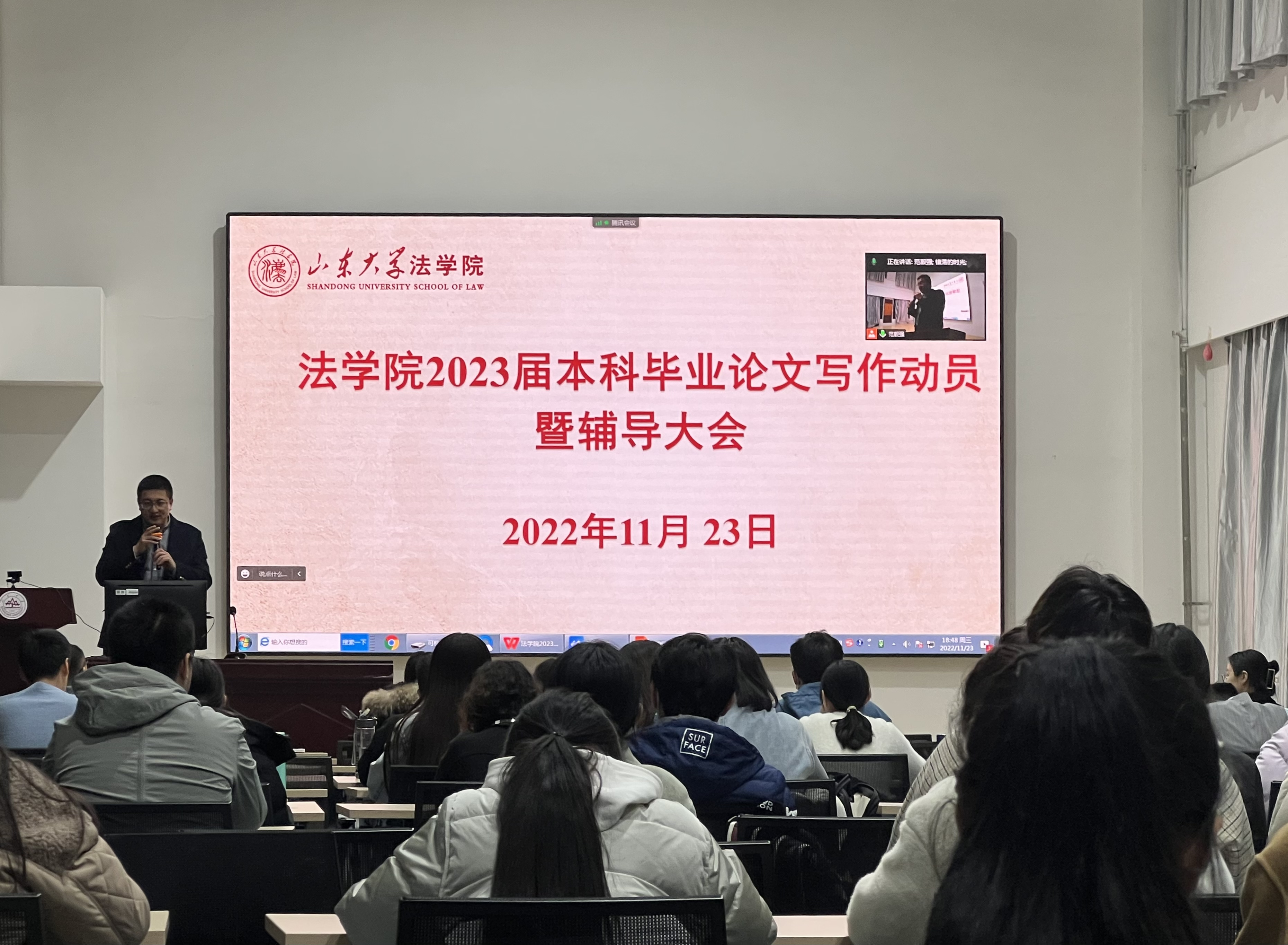 11月23日,法學院2023屆本科畢業(yè)論文寫作動員暨輔導大會在華崗苑北樓舉行,法學2019級和法學與英語雙學位班2018級畢業(yè)班學生共170余人通過線上、線下兩種形式參加會議。副院長馮俊偉教授作動員指導,副研究員宋保振作寫作輔導報告,教務秘書范毅強主持會議。