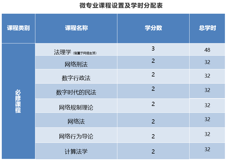 微專業(yè)共計17學(xué)分,課程設(shè)置注重法學(xué)與網(wǎng)絡(luò)安全的交叉融合,核心課程主要包括:法理學(xué)(側(cè)重于網(wǎng)絡(luò)生活)、網(wǎng)絡(luò)刑法、數(shù)字時代的民法、數(shù)字行政法、網(wǎng)絡(luò)規(guī)制理論、網(wǎng)絡(luò)法、網(wǎng)絡(luò)行為導(dǎo)論、計算法學(xué)。