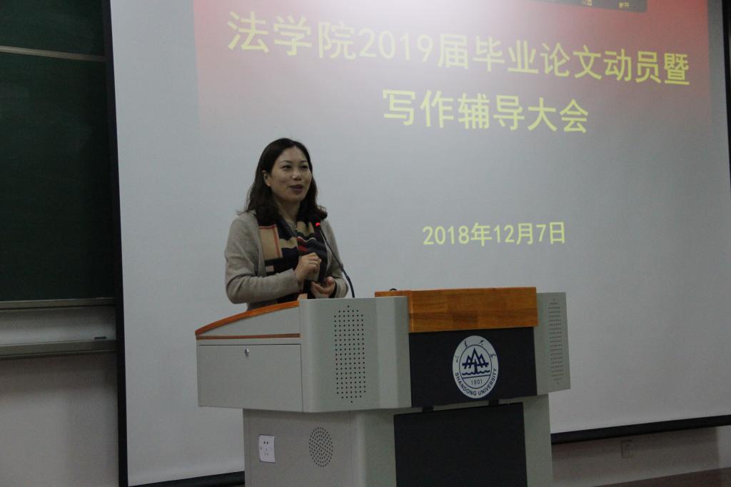 為貫徹落實山東大學2019屆本科畢業(yè)論文(設計)工作,提高學生的論文寫作水平和寫作質量,12月7日,法學院在振聲苑召開了2019屆本科畢業(yè)論文動員暨寫作輔導大會。法學院副院長張海燕教授作了動員講話、周嘯天副教授作了寫作輔導報告。
