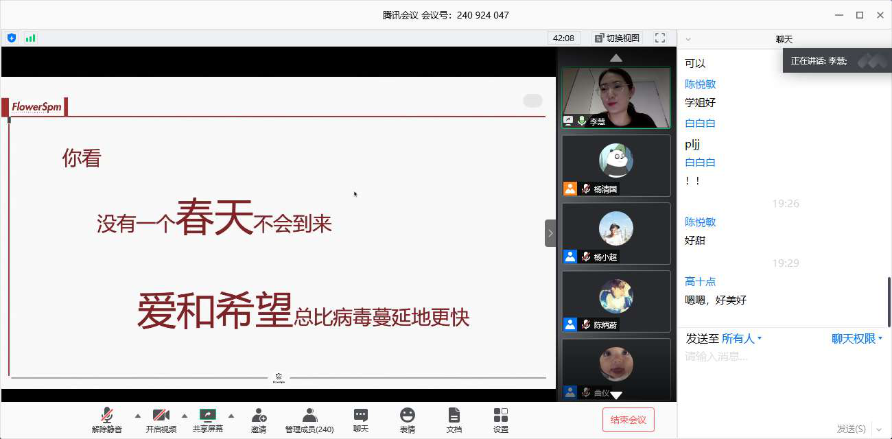 團(tuán)課伊始,山東大學(xué)第二醫(yī)院援鄂醫(yī)療隊(duì)成員常超向同學(xué)們講述了自己的戰(zhàn)疫故事,分享了援鄂抗疫過(guò)程中的心得體會(huì)。作為一名95后的她,看到前輩們?cè)诿鎸?duì)猖獗的新冠肺炎疫情時(shí)紛紛義無(wú)反顧放棄春季假期、主動(dòng)請(qǐng)纓前往支援,她備受鼓舞,也毫不猶豫地提交申請(qǐng)奔向湖北一線(xiàn)。常超母親曾對(duì)她說(shuō)過(guò):“在國(guó)家危難時(shí)貢獻(xiàn)一份力量,保護(hù)更多人的同時(shí)也要保護(hù)好自己。”這句話(huà)令她終身難忘而又倍感自豪。她提到,盡管在援鄂初期有很多困難需要大家去克服,但大家始終心懷希望,全國(guó)人民的掛念、患者的信任和來(lái)自家鄉(xiāng)的大饅頭都給予了她和她的同事們精神上的鼓舞與支持,使他們?cè)谂c病毒的戰(zhàn)斗中愈戰(zhàn)愈勇。常超這段關(guān)于成長(zhǎng)與責(zé)任的抗疫故事讓大家動(dòng)容,每一位團(tuán)員青年都在為常超的抗疫故事點(diǎn)贊,為新時(shí)代青年點(diǎn)贊!