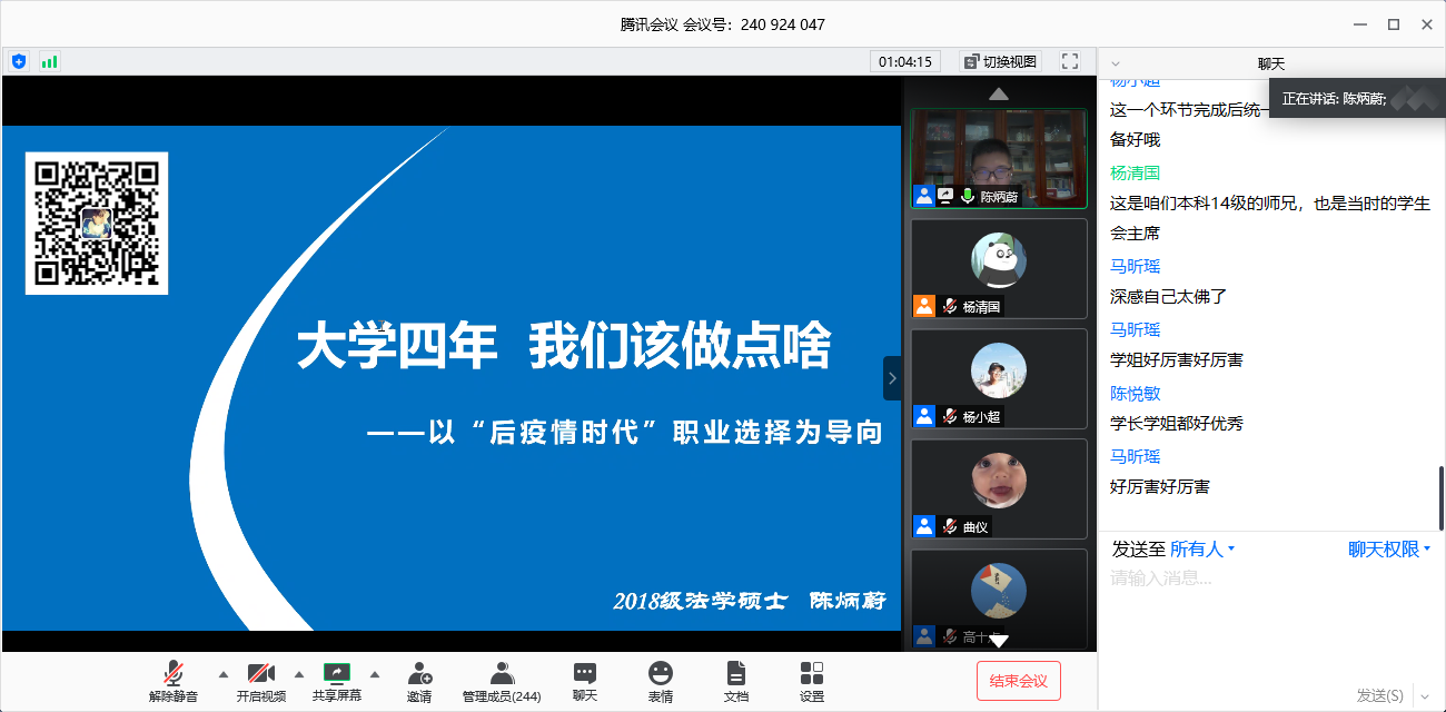 法學(xué)院團(tuán)委根據(jù)團(tuán)員青年的特點(diǎn),結(jié)合專(zhuān)業(yè)特色,邀請(qǐng)杰出青年代表講述戰(zhàn)疫故事,分享職業(yè)發(fā)展經(jīng)驗(yàn),助力青年學(xué)生充分高質(zhì)量就業(yè),切實(shí)提升居家學(xué)習(xí)實(shí)效,為培養(yǎng)各方面全面發(fā)展的高素質(zhì)人才不斷努力。
