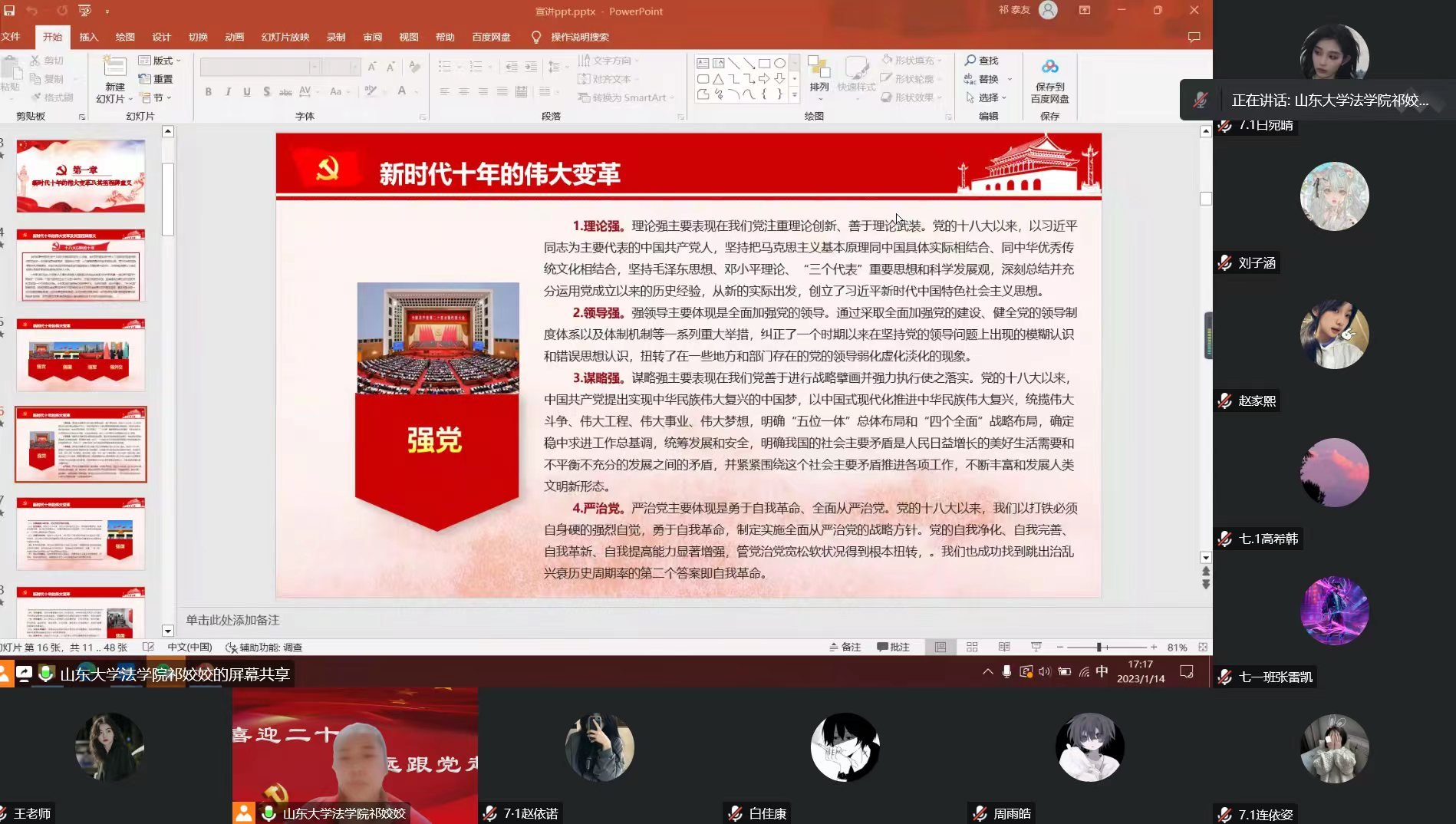 2023年1月14日,山東大學(xué)法學(xué)院黨的二十大精神青年師生宣講團宣講一隊面向河南省長垣市趙堤鎮(zhèn)華龍學(xué)校七年級一班30余名同學(xué)開展了一場線上專題宣講。此次宣講由該班班主任韓老師主持,山東大學(xué)法學(xué)院2022級研究生祁姣姣進(jìn)行了宣講。