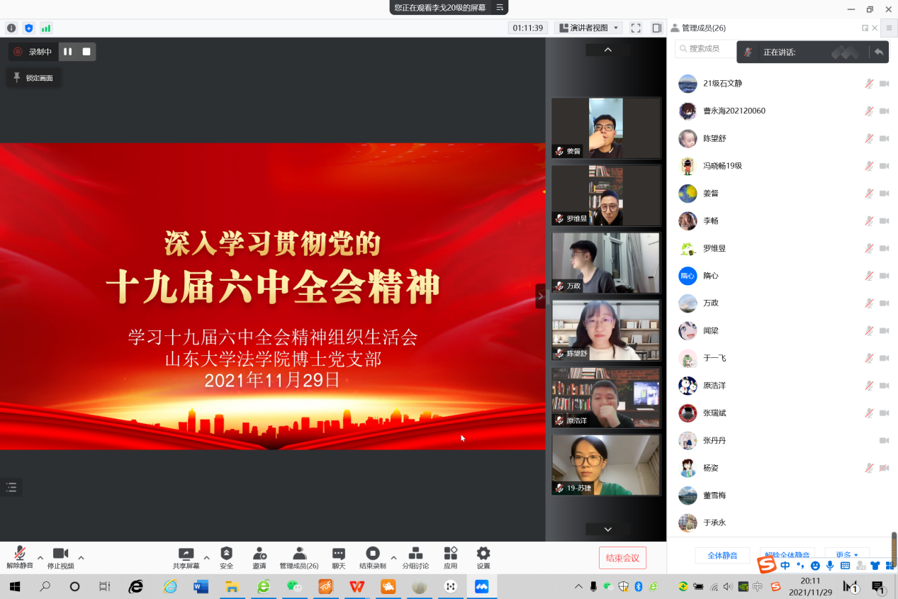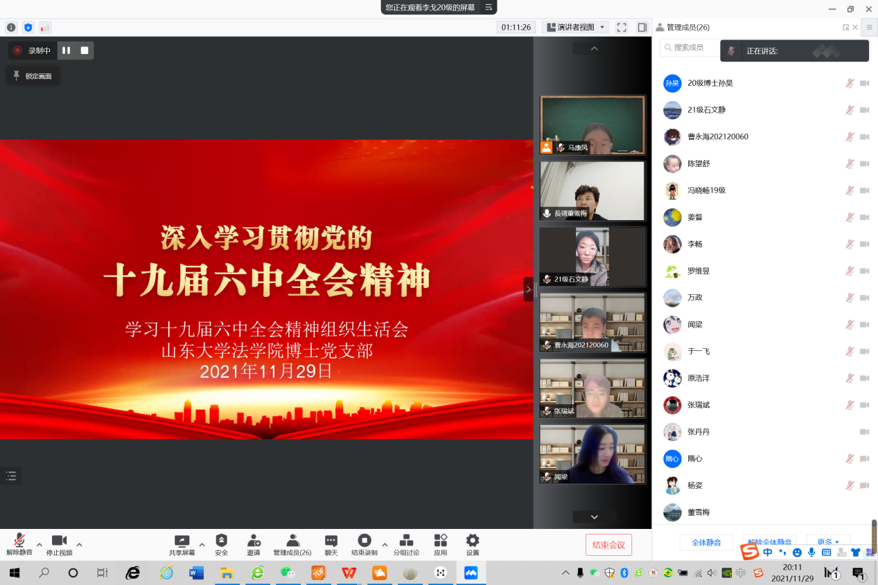 2021年11月29日晚19點(diǎn),法學(xué)院博士研究生黨支部以線上會(huì)議的方式開展學(xué)習(xí)“黨的十九屆六中全會(huì)精神”主題黨日活動(dòng)。組織委員李戈主持本次會(huì)議,張瑞斌領(lǐng)學(xué)本次。學(xué)院黨委副書記董雪梅應(yīng)邀參加本次會(huì)議。