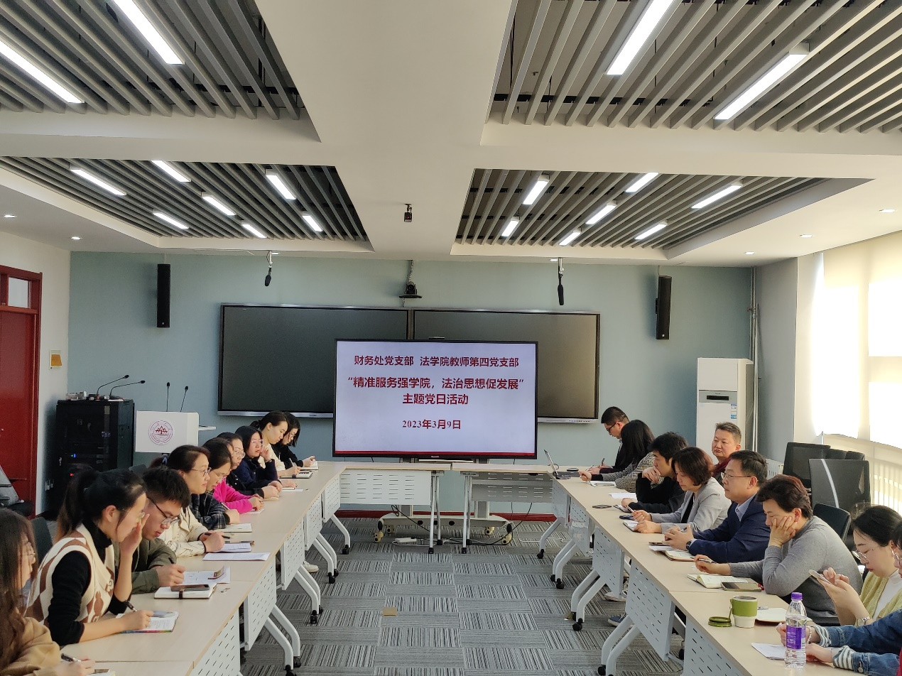 為深入學(xué)習(xí)貫徹黨的二十大,二十屆一中、二中全會(huì)精神,3月9日,法學(xué)院教師第四黨支部與青島校區(qū)財(cái)務(wù)處黨支部聯(lián)合開(kāi)展“精準(zhǔn)服務(wù)強(qiáng)學(xué)院,法治思想促發(fā)展”主題黨日活動(dòng)。法學(xué)院黨委書(shū)記于向明、黨委副書(shū)記董雪梅、副處級(jí)組織員江小荃,青島校區(qū)財(cái)務(wù)處副處長(zhǎng)、黨支部書(shū)記劉仁芝出席活動(dòng)。