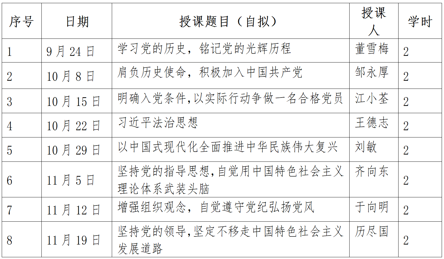 1.授課教材統(tǒng)一使用中共中央組織部指定的入黨積極分子培訓(xùn)用書《入黨教材》,黨校還將統(tǒng)一制作部分課件供參考使用。分為8個(gè)專題,安排學(xué)時(shí)16學(xué)時(shí)。