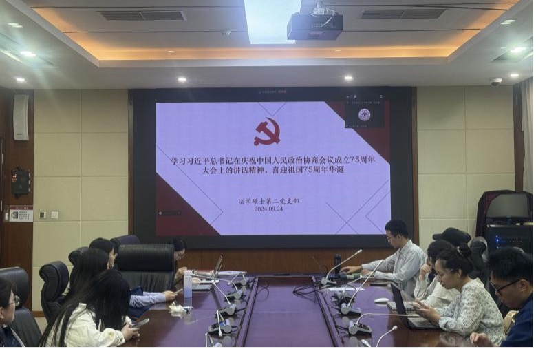 為深入學(xué)習(xí)貫徹習(xí)近平總書記重要講話精神,熱烈慶祝新中國75周年華誕,9月24日,法學(xué)院法學(xué)碩士第二黨支部組織學(xué)習(xí)習(xí)近平總書記在慶祝中國人民政治協(xié)商會議成立75周年大會上的講話精神。法學(xué)碩士第二黨支部全體黨員及團(tuán)支部全體同學(xué)參與本次學(xué)習(xí)。
