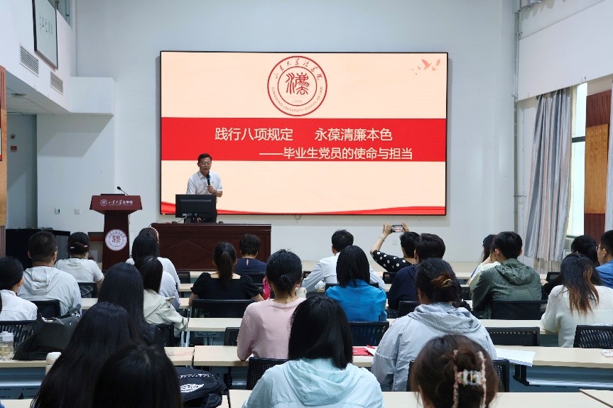 活動(dòng)最后,于向明書記以“踐行八項(xiàng)規(guī)定,永葆清廉本色”為主題向畢業(yè)生黨員講授主題黨課,詳細(xì)講述中央八項(xiàng)規(guī)定精神,結(jié)合具體案例開(kāi)展警示教育。于向明鼓勵(lì)畢業(yè)生黨員完成從“受教育者”到“傳播者”的角色升級(jí),殷切寄語(yǔ)畢業(yè)生黨員珍惜黨員身份,銘記校園所學(xué),堅(jiān)守崗位底線,讓中央八項(xiàng)規(guī)定精神成為人生精神底色。