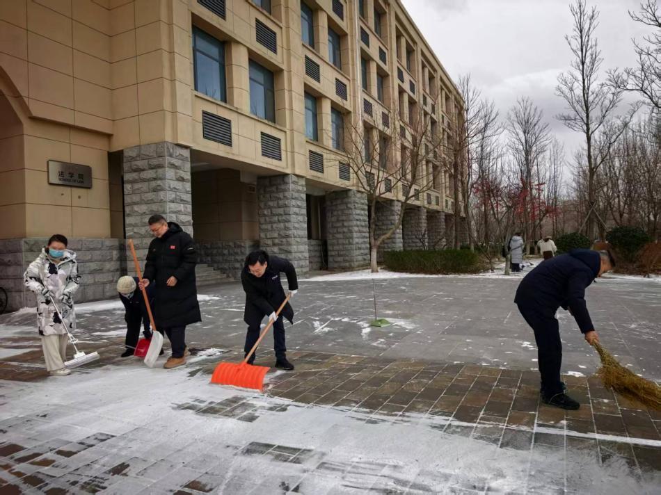 近日,青島校區(qū)迎來2026年第一場(chǎng)大雪,華崗苑北樓前廣場(chǎng)及部分路面凝結(jié)成光滑薄冰,給師生出行埋下安全隱患。1月19日一早,法學(xué)院教師第四黨支部組織行政人員進(jìn)行掃雪除冰,以實(shí)干暖民心,用擔(dān)當(dāng)護(hù)平安。