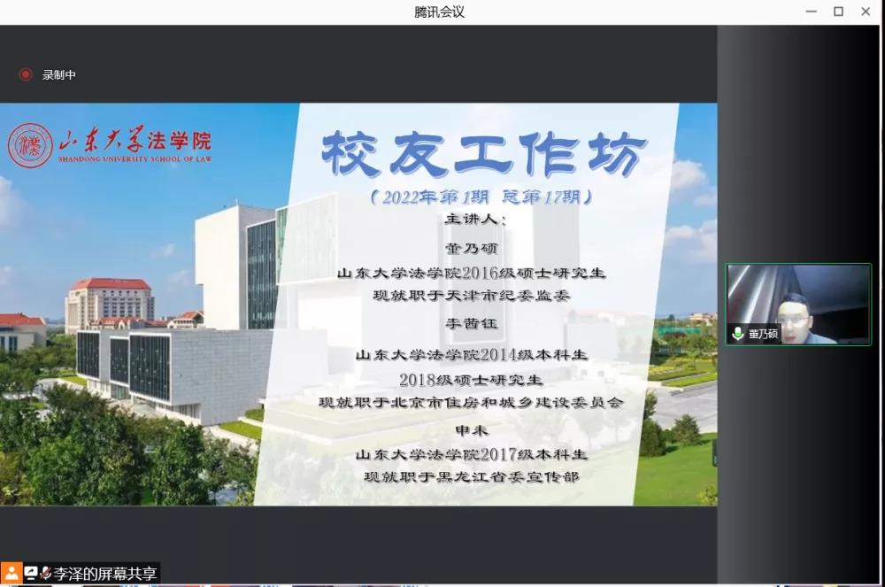 2月13日,法學院校友工作坊2022年第一期邀請到山東大學法學院2016級碩士研究生董乃碩,2014級本科生、2018級碩士研究生李茜鈺,2017級本科生申未三位校友,三位校友回顧當年備考之路,將備考經驗傾囊相授,同時分享自身的求職經歷與入職感悟。