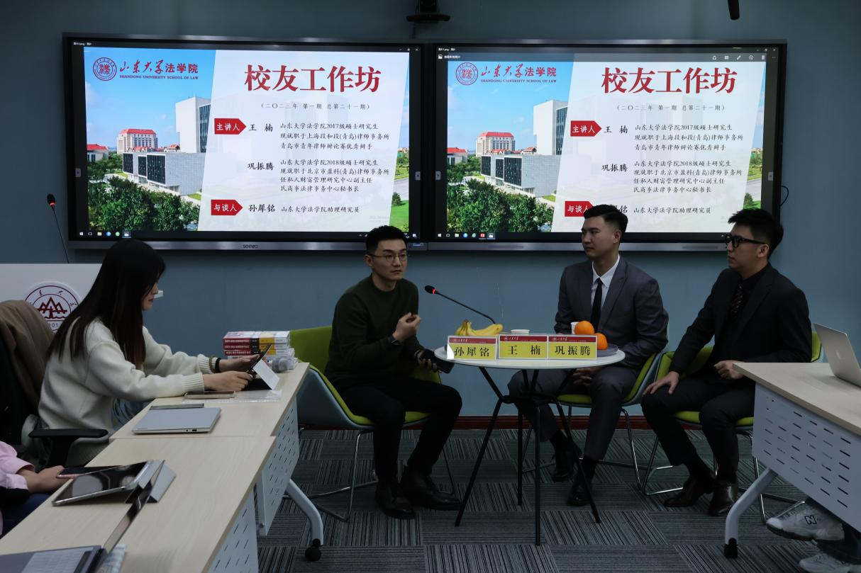 2月27日,法學(xué)院校友工作坊在華崗苑舉辦。活動(dòng)邀請(qǐng)到2017級(jí)碩士研究生、上海段和段(青島)律師事務(wù)所律師王楠校友和2018級(jí)碩士研究生、北京市盈科(青島)律師事務(wù)所律師鞏振騰校友,以“青年律師的執(zhí)業(yè)之路”為主題分享個(gè)人的職業(yè)選擇與規(guī)劃,并給予就業(yè)指導(dǎo)建議。法學(xué)院助理研究員孫犀銘作為與談人參與了此次活動(dòng)。